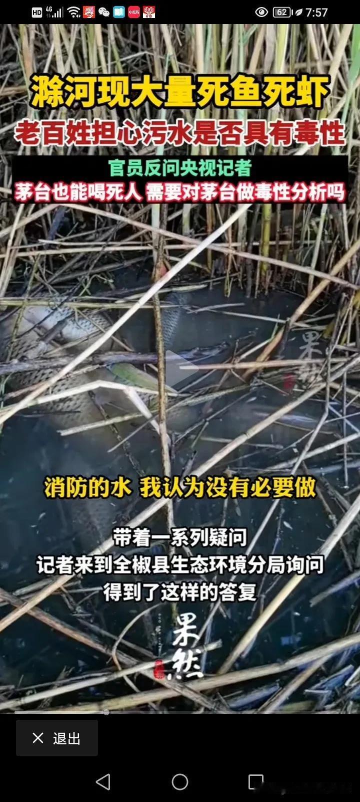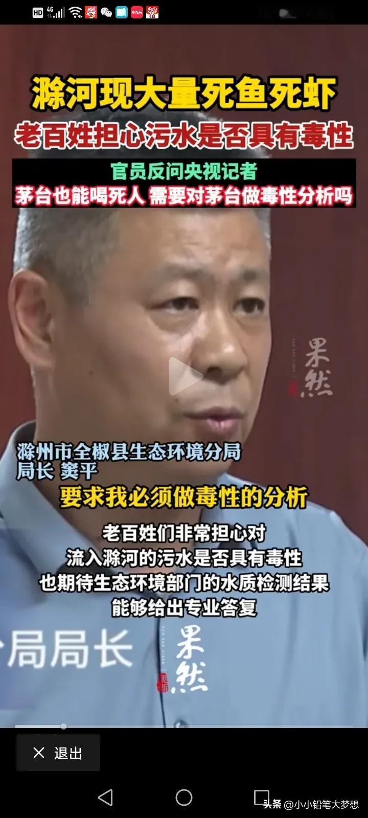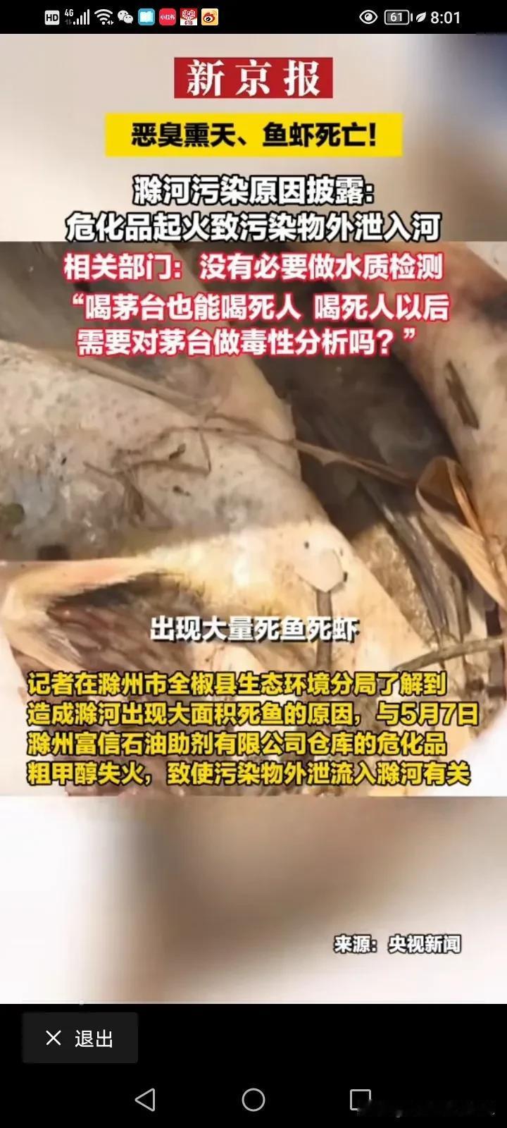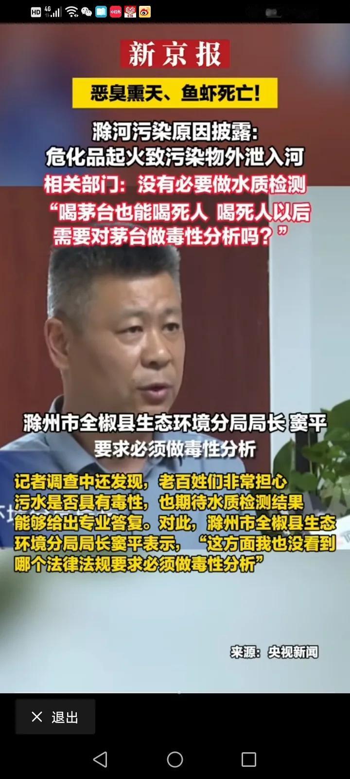 这哥们是咋当上这个局长的,真无语了!近日,有居民发现滁河南京浦口段突然的水被严重污染,出现了大量的死鱼死虾,还散发出恶臭。居民觉得水质被污染了,有可能与上游来水有关。 后来经过调查,发现是滁州一家名为富信石油助剂有限公司仓库的危化品粗甲醇失火,消防灭火之后消防水和雨水把污染物泄流入滁河有关。 老百姓知道这是一个化学品仓库的污水流入了这条河,所以非常的担心这水质是否被污染,是否有毒性?所以老百姓们提出要求相关部门做一下水质检测! 但是滁州市全椒县生态环境分局 局长 窦平却说:“没有哪一条法律法规,要求我做毒性分析,我认为消防水没有这个必要,喝茅台也能喝死人,是不是喝死人也要对茅台茅做毒性分析?” 河水居然跟茅台混在一起来说,这个是偷换概念,消防的水没有必要做,但消防的水用于化工灭火,结合化工污染物后,当然要做,这是化工污染物!不处理问题还理直气壮,腐败至极,这个是责任心的问,居然把逃避责任的境界发挥到淋漓尽致。竟然没有一点责任心都没。 这种人是怎么当上局长的?不敢检测水质是不是怕检测出有毛病?一个最没有环保意识的人恰恰做了环保局长,应该严查此人。