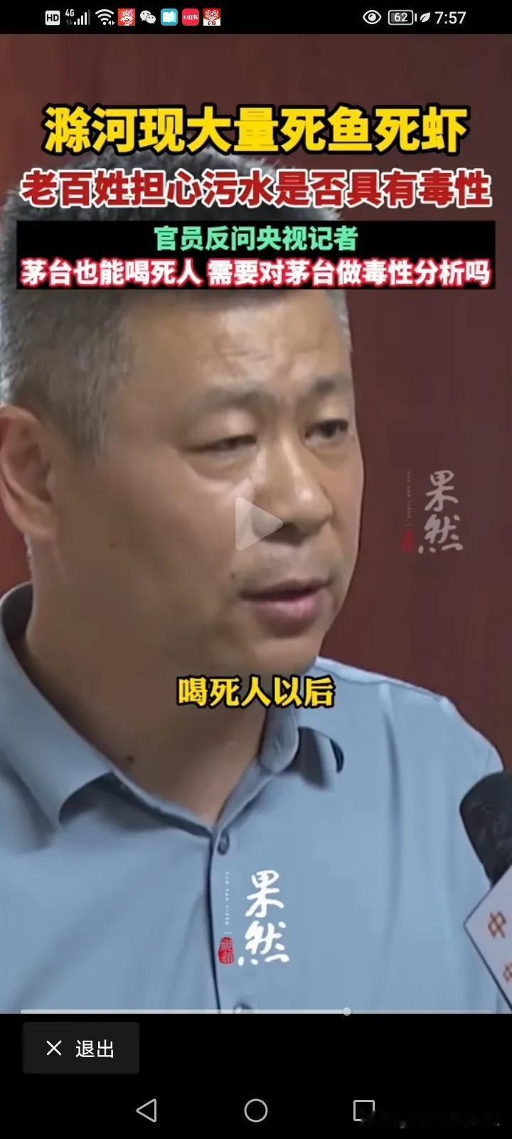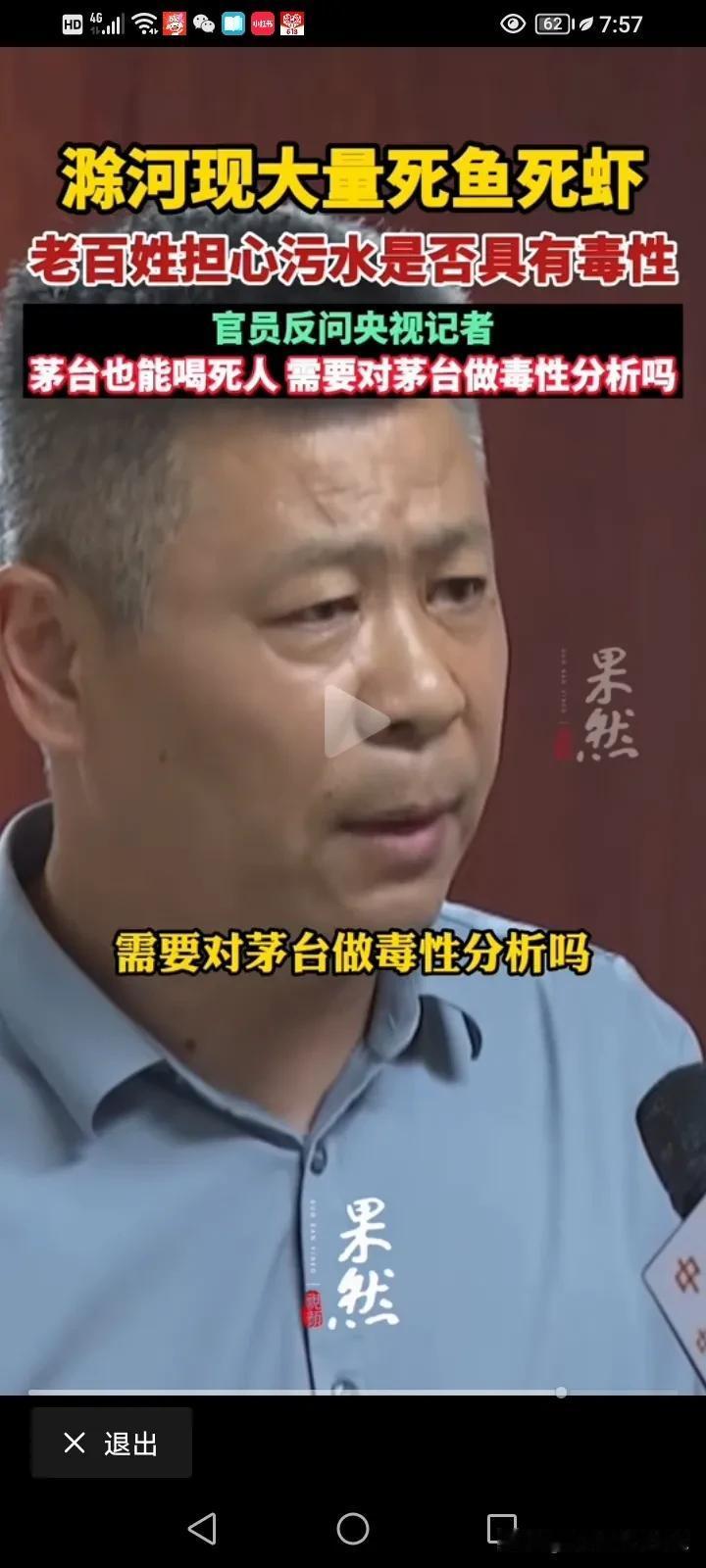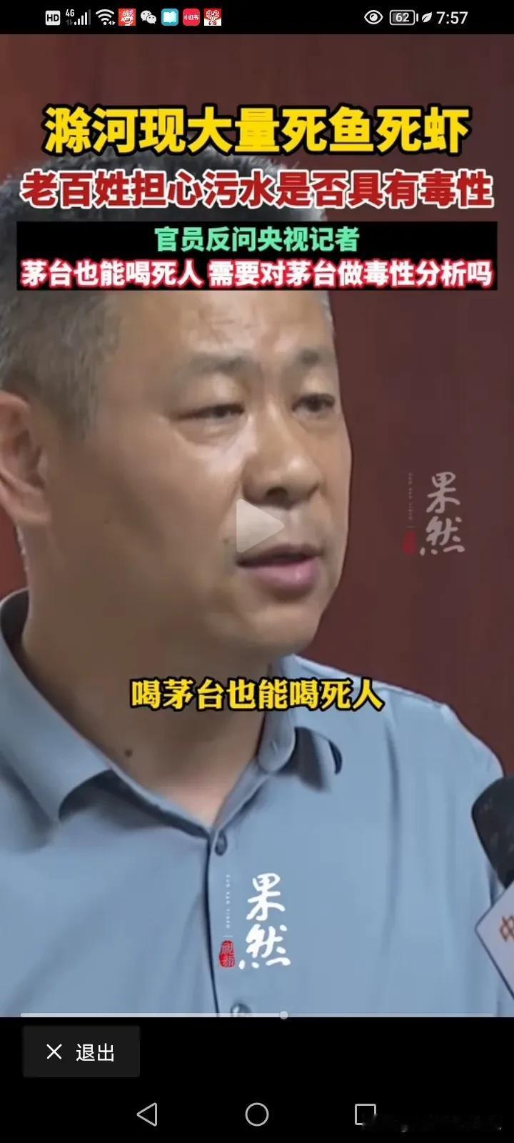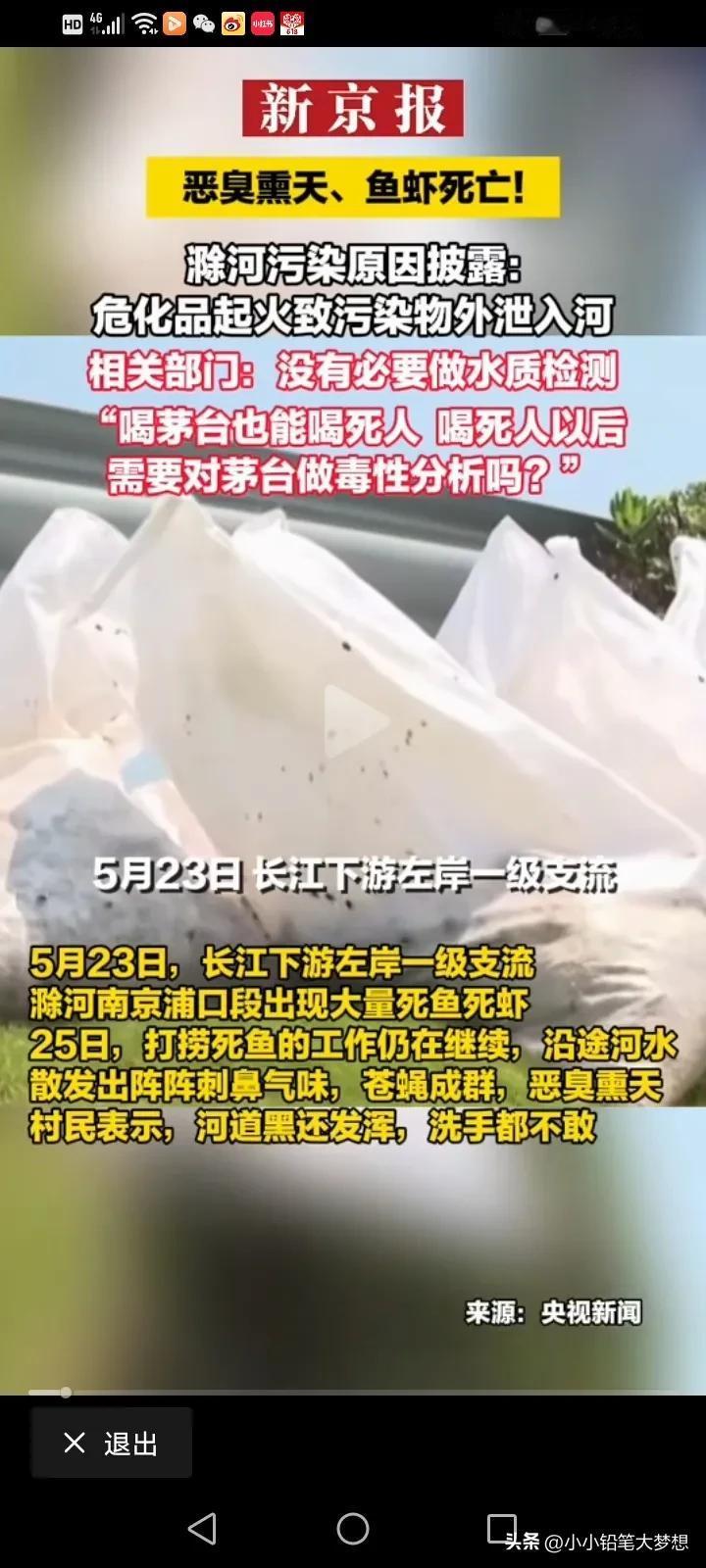 这哥们是咋当上这个局长的,真无语了!近日,有居民发现滁河南京浦口段突然的水被严重污染,出现了大量的死鱼死虾,还散发出恶臭。居民觉得水质被污染了,有可能与上游来水有关。 后来经过调查,发现是滁州一家名为富信石油助剂有限公司仓库的危化品粗甲醇失火,消防灭火之后消防水和雨水把污染物泄流入滁河有关。 老百姓知道这是一个化学品仓库的污水流入了这条河,所以非常的担心这水质是否被污染,是否有毒性?所以老百姓们提出要求相关部门做一下水质检测! 但是滁州市全椒县生态环境分局 局长 窦平却说:“没有哪一条法律法规,要求我做毒性分析,我认为消防水没有这个必要,喝茅台也能喝死人,是不是喝死人也要对茅台茅做毒性分析?” 河水居然跟茅台混在一起来说,这个是偷换概念,消防的水没有必要做,但消防的水用于化工灭火,结合化工污染物后,当然要做,这是化工污染物!不处理问题还理直气壮,腐败至极,这个是责任心的问,居然把逃避责任的境界发挥到淋漓尽致。竟然没有一点责任心都没。 这种人是怎么当上局长的?不敢检测水质是不是怕检测出有毛病?一个最没有环保意识的人恰恰做了环保局长,应该严查此人。