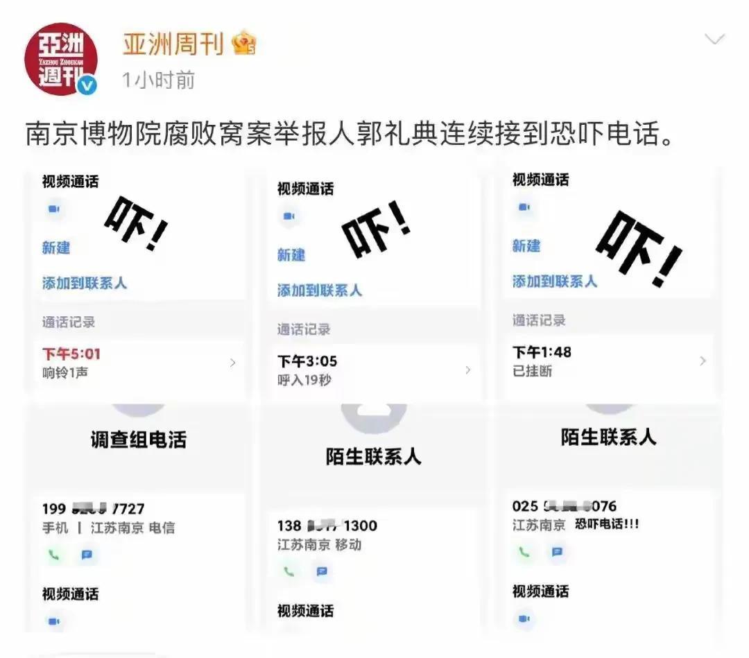 一边是调查组一进场,一边是举报人南博退休员工郭礼典接到多个陌生电话恐吓。