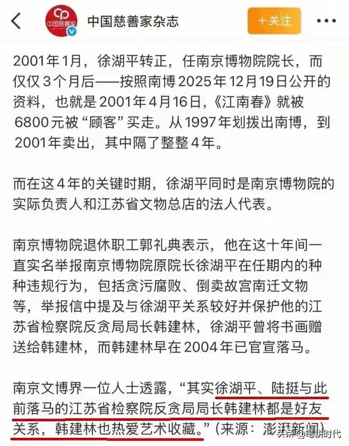 南京文博界有知情人透露,“徐湖平、陆挺跟之前落马的韩建林都是好友,韩建林还特爱艺术收藏。