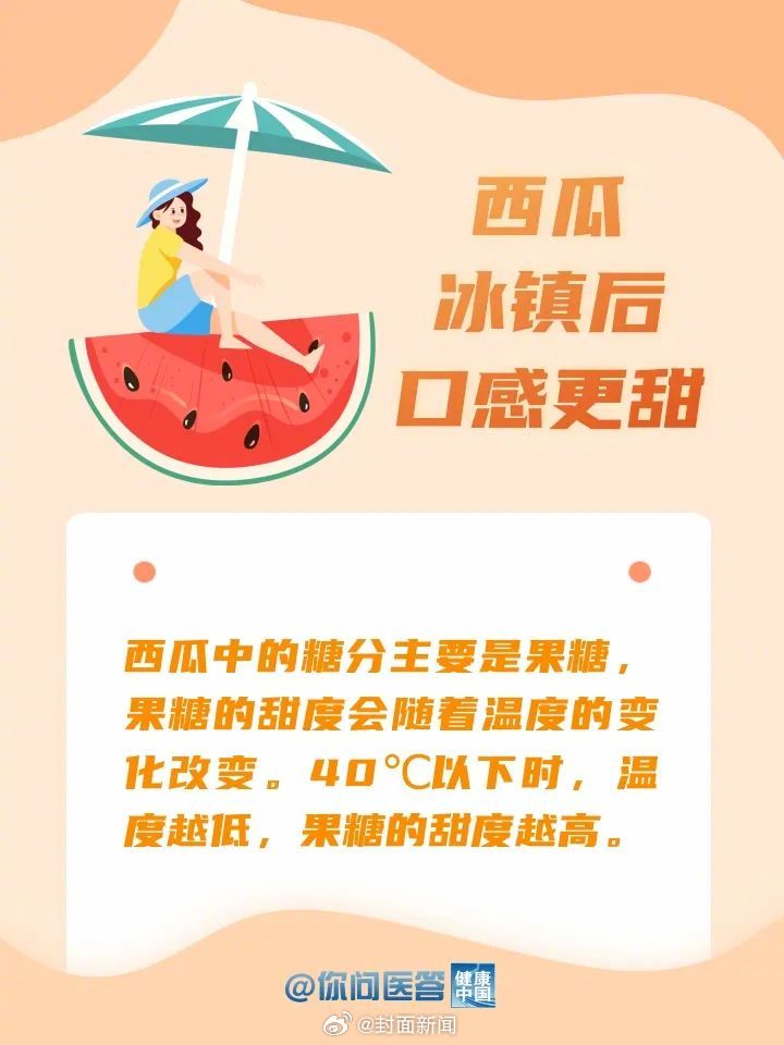 【#爱吃冰西瓜的原因找到了#!#西瓜冰一下会更甜#】随着气温不断攀升,“吃瓜”正当时。占据“夏季水果顶流”位置的西瓜,冰镇后仿佛更甜了。西瓜中的糖分主要是果糖,果糖的甜度会随着温度的变化改变。40°C以下时,温度越低,果糖的甜度越高。不仅是西瓜,苹果、梨、葡萄、荔枝等富含果糖的水果,冰一下都会更甜。(健康中国)