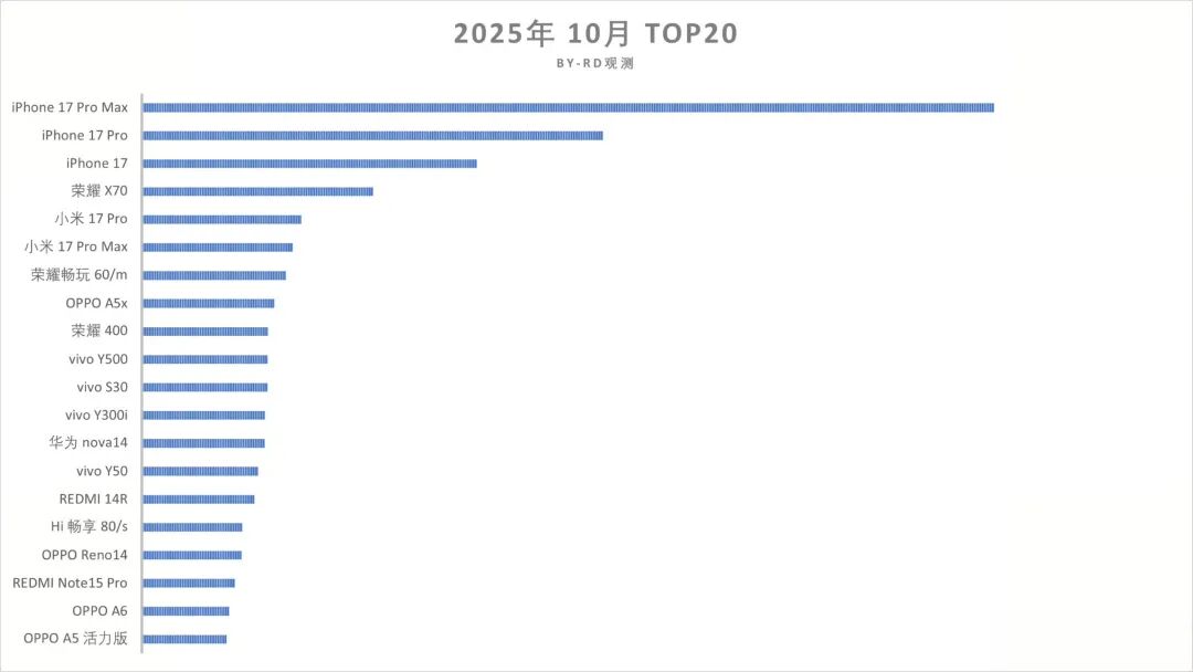 知名博主RD观测,日前公布了10月份国内手机销量大概情况,消费者可以大致的知道哪些机型很畅销,哪些是冷门机型,大家可以做个参考!