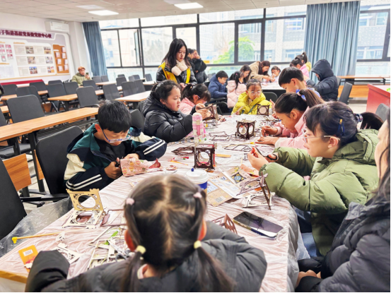当色彩斑斓的织锦材料包分发到手中,孩子们立刻化身“小小非遗传承人”。穿线、编织、塑形、装灯,每一个动作都专注而认真,稚嫩的手指在丝线间穿梭,勾勒出灵动的图案。创作间隙,大家围坐在一起,分享创意巧思,交流制作心得,偶尔传来的欢声笑语与丝线的摩挲声交织,让书院充满了温馨的节日氛围。在动手实践中,孩子们不仅掌握了织锦技艺的精巧,更真切感受到中华传统文化的匠心之美。