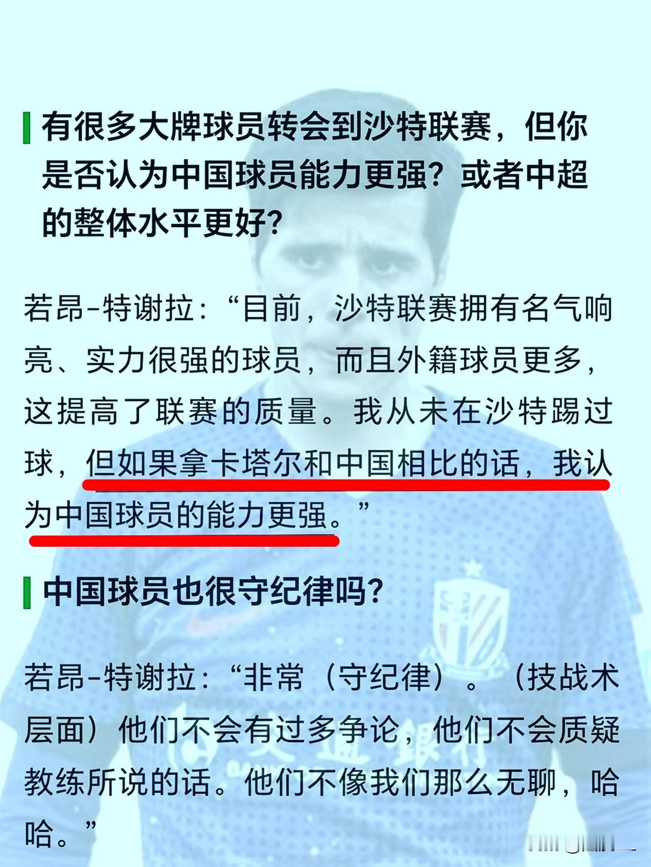 这话谁信啊?严重怀疑特谢拉在明目张胆的说谎。 特谢拉的技术没被中国男足同化,人情世故看样已被彻底同化,近日在接受记者采访时特谢拉对中国男足球员赞美有加,表达了三个观点: 1、中国球员的能力要强于卡塔尔球员。 2、中国球员非常守纪律。 3、中国球员非常勤奋且精力充沛。
