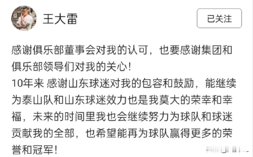 双向奔赴,俱乐部有情,球员有意!山东泰山官宣和球队功勋门将王大雷成功续约,王大雷也通过社媒对俱乐部以及球迷表示感谢: “感谢俱乐部董事会对我的认可,也要感谢集团和俱乐部领导们对我的关心! 10年来感谢山东球迷对我的包容和鼓励,为泰山队和山东球迷效力也是我莫大的荣幸和幸福,未来的时间里我也会继续努力为球队和球迷贡献我的全部,也希望能再为球队赢得更多的荣誉和冠军!”