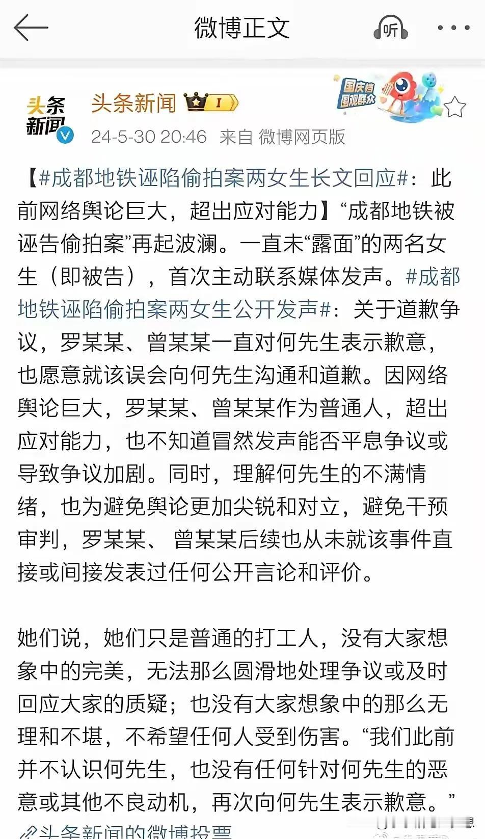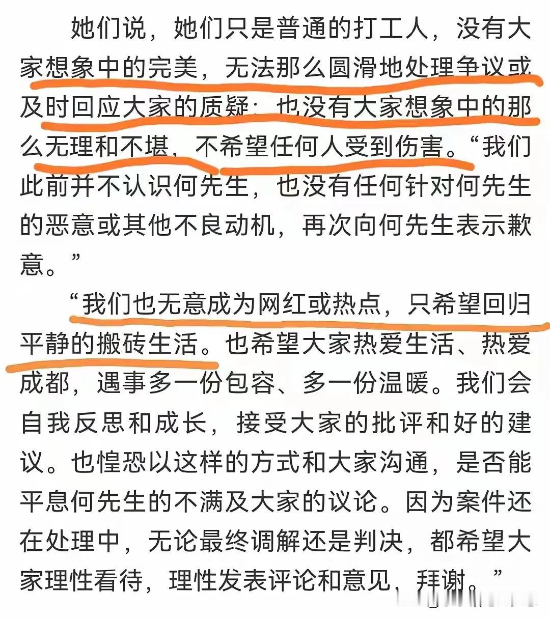 “成都地铁被诬陷偷拍案”两名女生愿意道歉,但是这种道歉真是敷衍的道歉!道个歉,还把自己当成了受害者,这篇小作文写的绝了! 两名女生找到了何先生,表示愿意道歉而所谓的道歉,就是让人写了一篇稿子,我最搞笑的是这个稿子,还把日期给搞错了,还能不能上点心啊? 而这个道歉还把自己当成了受害者?这一篇小作文啊,写的她们好可怜啊,觉得他们太无奈了,她们是否知道她们这一个所谓迟来的道歉,让别人知足浪费了一年时间,跑断了腿,见了无数次律师和法官换来的,跟女朋友分了手,还丢了工作“求”来的! 最后那一句话在更恶心:“我们只是普通的打工人,没大家想的那么完美,无法那么圆滑的去处理事情,没大家想的那么无理和不堪……~” 哪有那么多事儿啊,能不能诚恳一点?直接拍个视频,面对大众挺广众的表示自己错了真的有那么难吗?你羞辱我的时候,恨不得要告诉全世界,当你道歉的时候,却这样子一点诚意都没有,只想偷偷的跟我说? 这件事情你们怎么看?