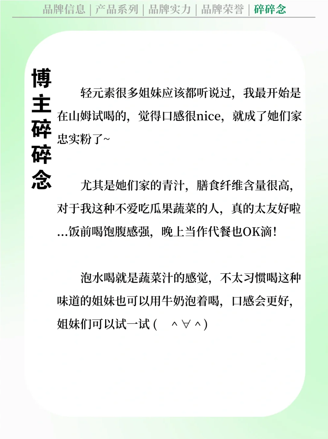 😍 轻元素很多姐妹应该都听说过,我最开始是在山姆试喝的,觉得口感很nice,就成了她们家忠实粉了~尤其是她们家的青汁,膳食纤维含量很高,对于我这种不爱吃瓜果蔬菜的人,真的太友好啦...饭前喝饱腹感强,晚上当作代餐也OK滴!