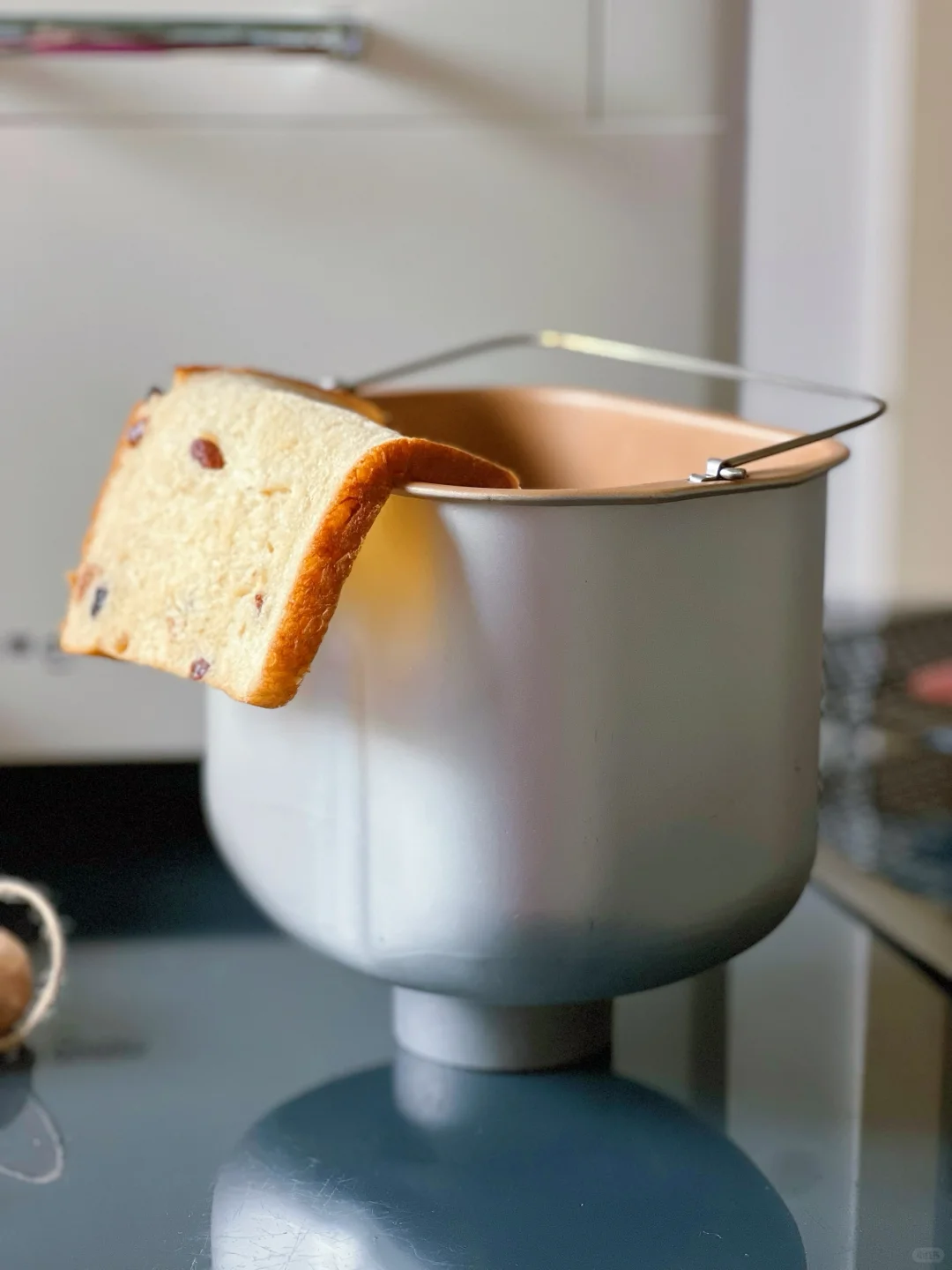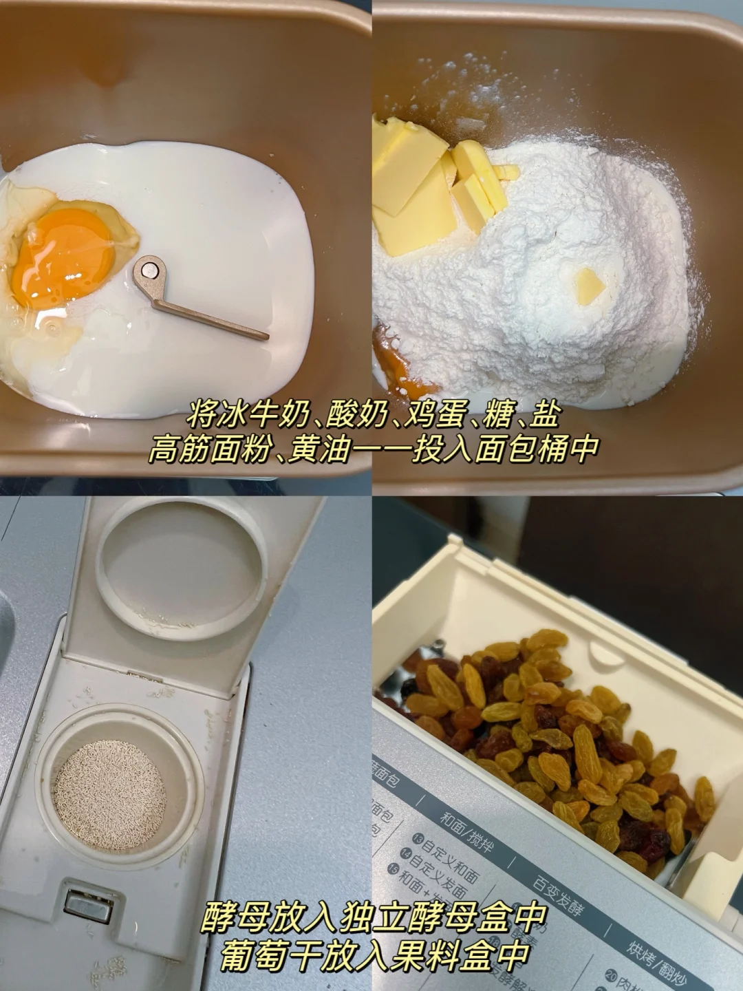 1️⃣将冰牛奶、酸奶、鸡蛋、糖、盐、黄油、高筋面粉按顺序投入面包桶中,酵母放入独立酵母盒中,葡萄干放入果料盒中