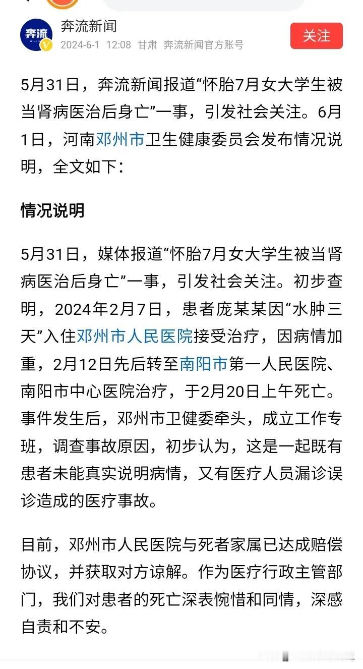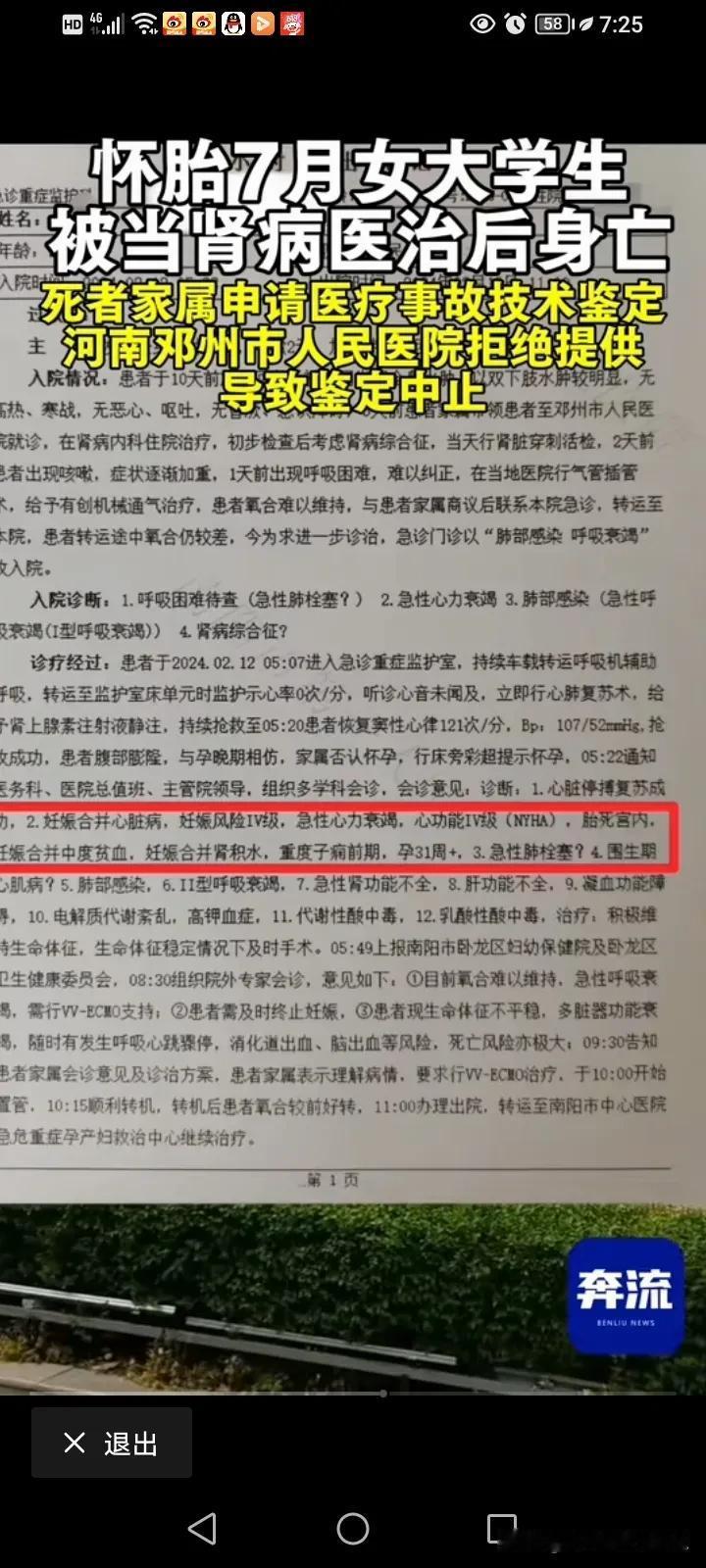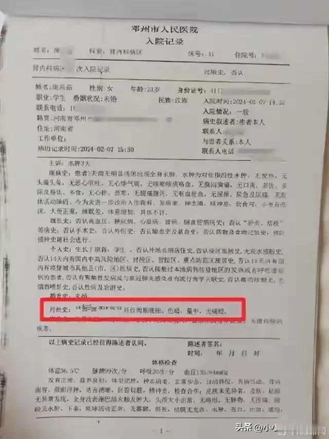 怀胎7月女大学生被当肾病医治后身亡”一事,病历写着:月经正常!医生一定是问了的,但女孩绝对隐瞒了。这里有一个重点就是大二女生的父母长年在杭州打工,只有过年才回家。 事件的大概脉络: 2月7日,年二十六。23岁女生的父母回老家,发现女儿不对劲,孩子说肚疼然后到河南南阳邓州市人民医院检查,被确诊为肾病综合征入院治疗。 2月11日,病情严重,出现昏迷。 2月12日凌晨转院南阳市第一人民医院抢救并转。抢救时医生发现“患者腹部膨隆”排做了彩超,并安排专家会诊后认为是妊娠合并心脏病,胎死腹中,孕31周+。 2月12日转南阳市中心医院急危重症孕产妇救治中心,安排剖宫取胎手术,手术后,大二女生还是昏迷状态。 2月19日,消化道出血、休克。 2月20日,心脏骤停,死亡。 家属认为南阳邓州市人民医院误诊,明明女儿是怀孕七个月,胎死腹中,但是,邓州市人民医院却误诊为肾病综合征,并误用大量激素治疗和进行肾穿刺手术,最后导致女儿白白丢了性命。 父亲为了查明女儿的死因,所以申请了医疗事故技术鉴定,但是邓州市人民医院故意不提交鉴定材料,导致鉴定中止。 现在大二女生的尸体还在殡仪馆。 因为孕晚期导致的水肿,所以医生误诊为肾病综合症,心电图、血常规、尿检都检查了,偏偏就没做B超。 我很清楚的看见了病历上写着:月经正常!医生一定是问了月经史,女生故意隐瞒,没说实话,再问有没有男朋友,女生表示没交往,医生肯定疏忽了,误信了女生,认为该女生没怀孕。 女生隐瞒,肯定是怕父母责怪,父母长年在杭州打工,只有过年才回家,平常肯定是缺乏沟通,女孩肯定是知道自己怀了的,毕竟已经23岁了,但是家庭性教育的缺失,导致女孩不敢提,不敢说真话。 最大的罪魁祸首就是那个造成一切的男人! 如果患者配合,早发现问题了,唉,因为隐瞒,一尸两命,医生肯定是大意了,各打50大板!