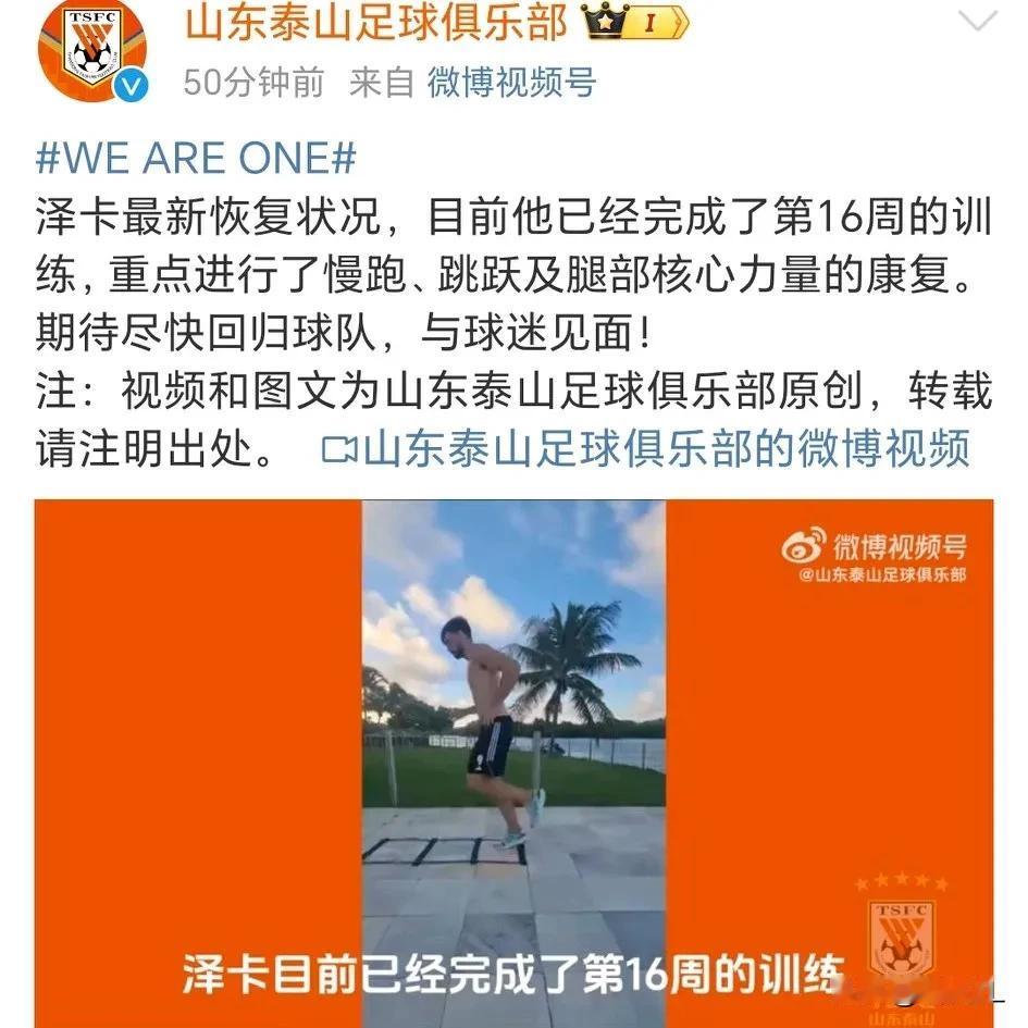 山东泰山官博发布重磅消息,疑似回击媒体。 泰山队重伤的外援泽卡已经能下地,已经完成了第16周的训练,同时进行了慢跑、跳跃及腿部核心力量的康复。 而在不久前山东体育频道的一档栏目中,嘉宾高翔曾直言泽卡还不能下地,引来球迷吐槽,山东泰山官方也回击这一说法,泽卡不但可以下地,而且已经活蹦乱跳了。