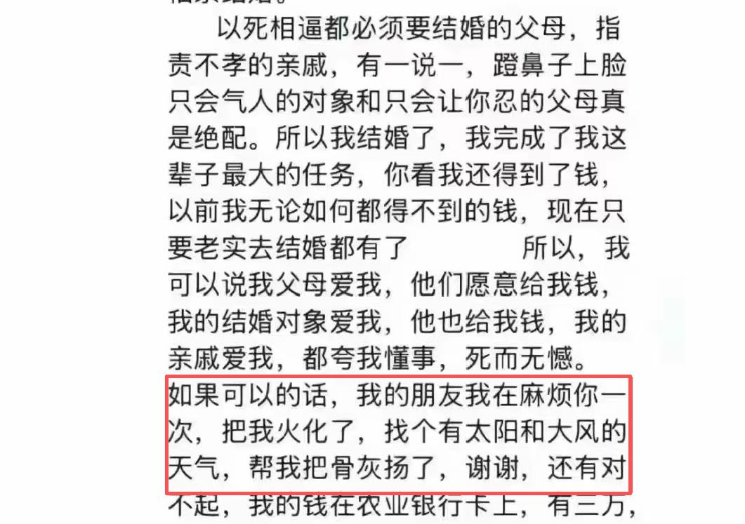 从她的遗书中,就能看出,大学4年,父母就已经在催婚了。