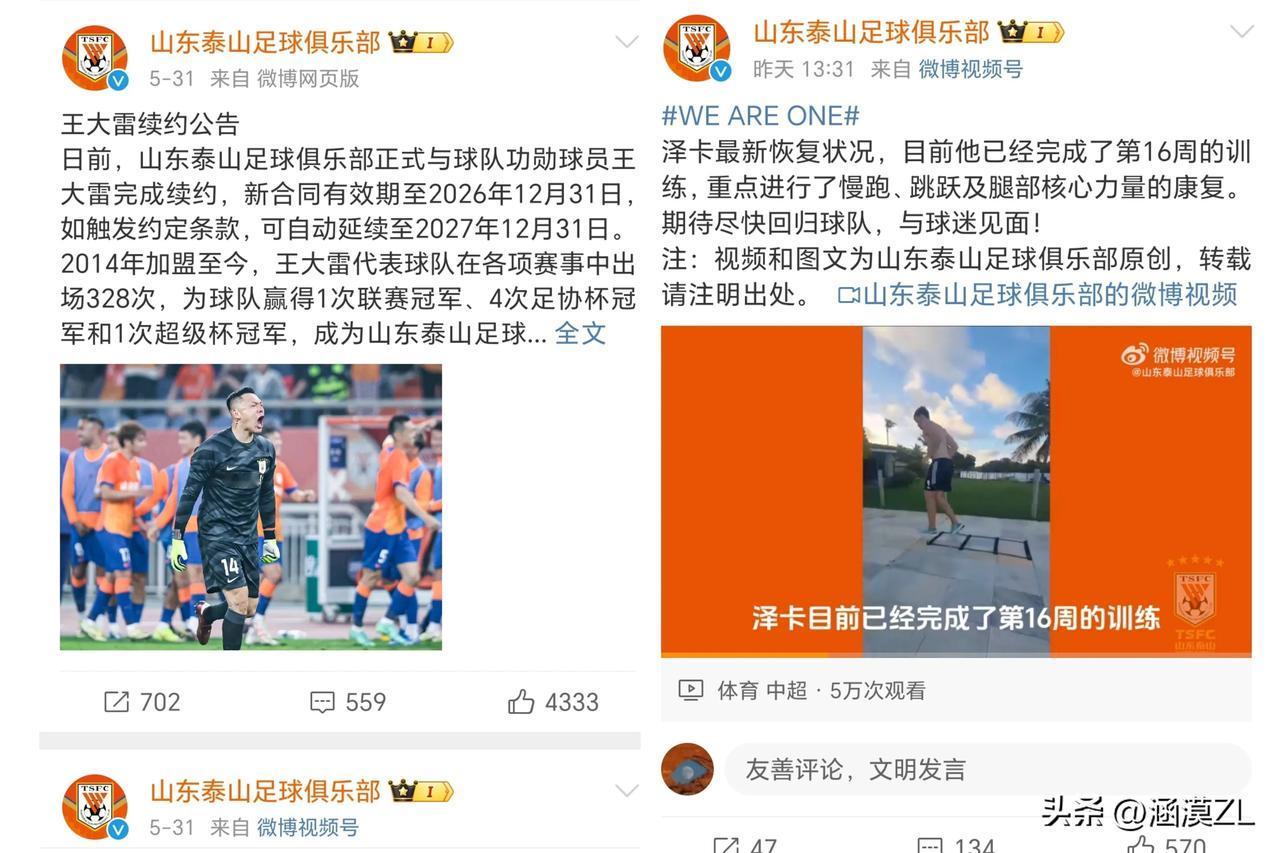 好兆头!泰山俱乐部高层已悄然发生了改变,还差重要一环。 5月31日,官方宣布成功续约王大雷,这一决定既顺应了球迷心愿,也是对球队的一大利好事件。 6月2日,官博发布消息,泽卡目前恢复良好,回击了山东体育频道某嘉宾爆出的“泽卡至今还不能下地”的言论。 两件事均体现了俱乐部管理层该有的积极作为,打消了球迷此前的各种质疑和顾虑,如果夏窗期间在引援上再能有所动作就完美了。