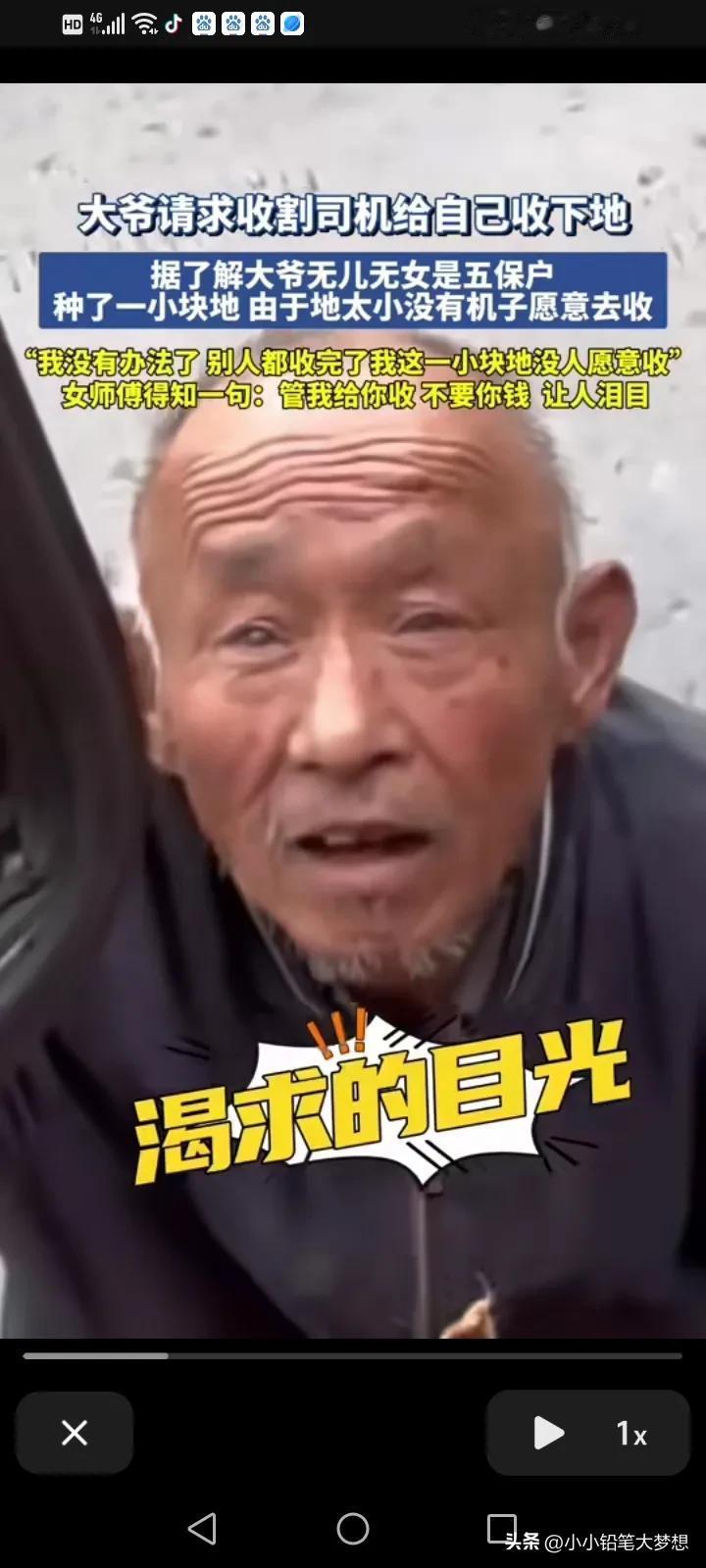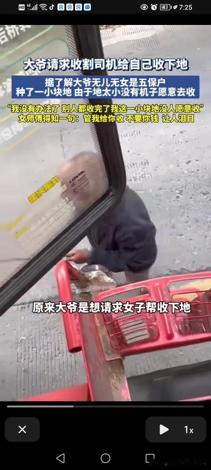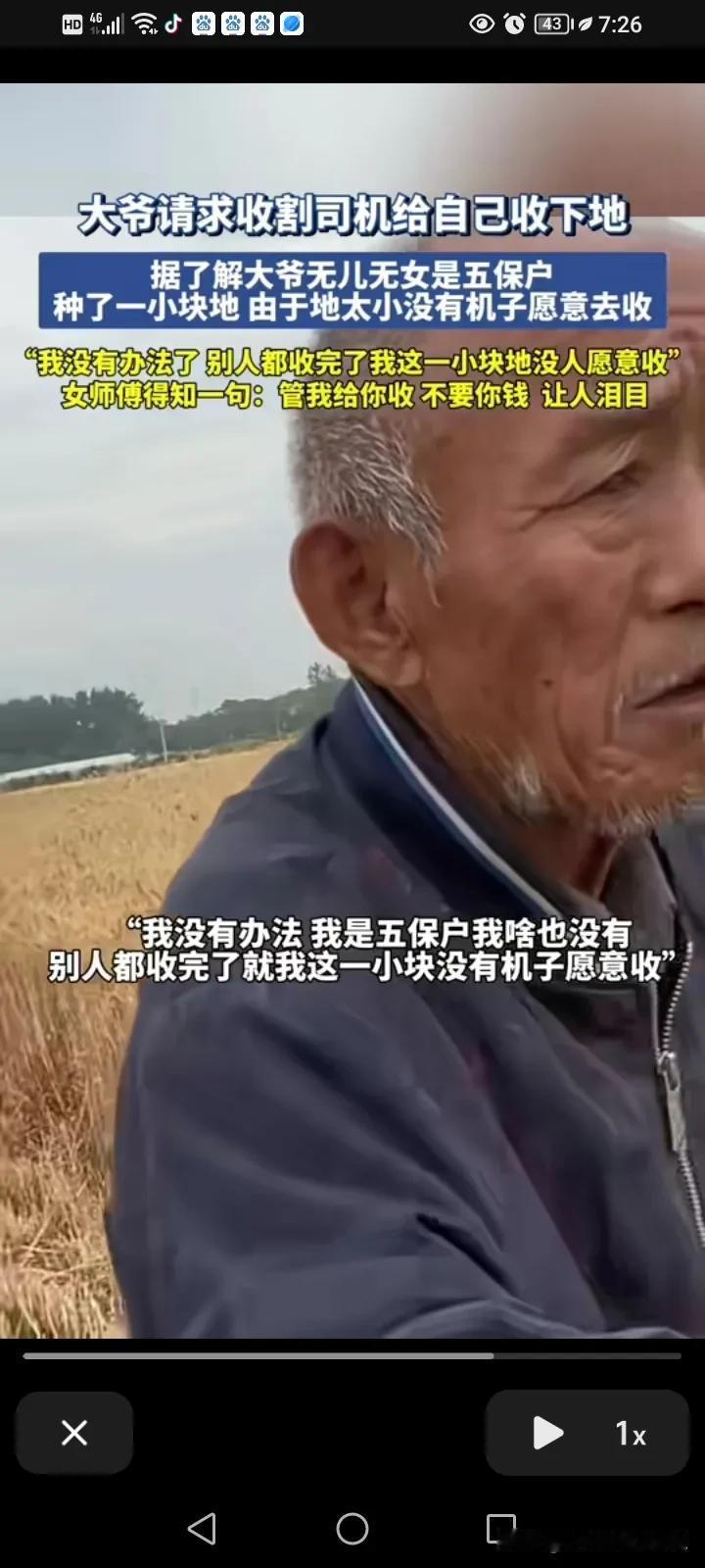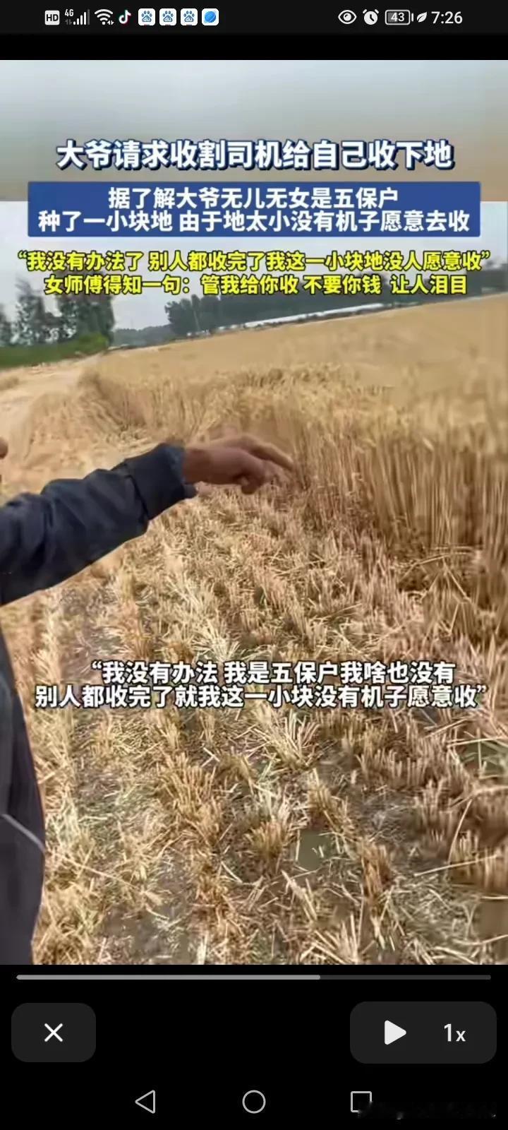 泪目了!近日,安徽,一名女子把车停在路边等待的户主,一位老大爷突然走了过,拿着一条木棍敲了一下车子的玻璃,女子有点害怕,他以为大爷精神不正常,所以她警惕性的拿起了手机拍下这一幕,后来这位大爷又转了一圈又继续敲了一下她车上的玻璃,女子打开了车门问他什么事? 大爷用渴求的眼光看见女子,对她说能不能帮他收一下地里的麦子? 女孩得知大爷是想让他割麦子的,叫大爷领一下路,只见大爷佝偻着身体领着他前往自己的麦地,到了地里之后,老爷子说:我没有办法,我无儿无女,我是五保户我啥也没有,自己种了一块地,别人的都收完了,他的这一块地没有机子愿意来收。 大爷指着这块地问女孩要愿不愿意帮他收? 女孩大声的回应他:“我给你收!” 大爷问多少钱? 女孩说:“不要你收钱!” 女孩跟大爷说,因为自己先答应了另外一个户主要先收他的,做人要讲诚信,等那边收完了就过来帮他收。让大爷放心,自己一定会过来再找他! 女孩帮那边户主收完已经是下午了,折回没到找大爷,刚好在路边碰到一个大姨,她向大姨问了问,刚好碰到的这一个大姨是认识他的。 原来大爷一直等着她,她立马帮大爷收了,发现大爷连拉麦子的车都没有,她直接把麦子给他送回家。 等麦子全部卸下来之后,大爷连忙掏出了200块钱,要给女孩,女孩说大爷这钱就留给你买点吃的吧,我说了不收钱就是不收钱,遇见这种事情能帮就帮! 我就是纳闷儿,旁边的农户应该是同村的邻里乡亲吧,举手之劳都不帮,或许闹过矛盾?还有那些车为啥都不给这么可怜的老人收麦子,人家也不是不给钱,旁边的邻居的格局被这女子比下去了。 看到收割机开到家里卸麦我瞬间泪目,不得不说,这个女孩真的很善良,评论区里面的人懂的都说,她割的麦茬很低,一个是少丢麦子,再有就是麦茬低利于直播玉米,后期浇地也方便,但是对她而言一是费油,二是费车,三是费时间,我们这边没有种麦子,真的不懂这些,原来一个小小的细节,能体现一个女孩这么优良的品德,怪不得她之前就能上央视!