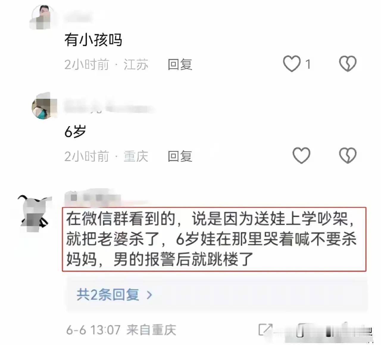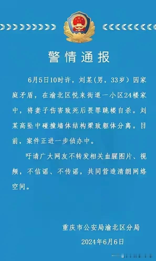 唉,孩子真的太惨,男的就不能看在孩子的份上,放过他的妈妈吗?现在他们两个都没了,只剩孩子,让孩子怎么过?有没有想过孩子的心灵创伤,可能是一辈子的! 33岁了,按道理来说,应该成熟,情绪也应该稳定了,居然还做出这样的事情。 重庆的一名男子,就因为一点家庭矛盾居然把妻子给杀了,更可恨的是当着孩子的面!然后他还想逃避责任选择从24楼跳下去自行了断,孩子才六岁啊,这不是苦了孩子吗? 过不了就离了吧,何必互相牵扯那么多,何必那么狠毒,有的时候在想,相恨相杀,要到什么时候?为何要纠缠在一起,彼此放过对方不行吗? 有的时候在想婚姻到底给双方带来了什么?
