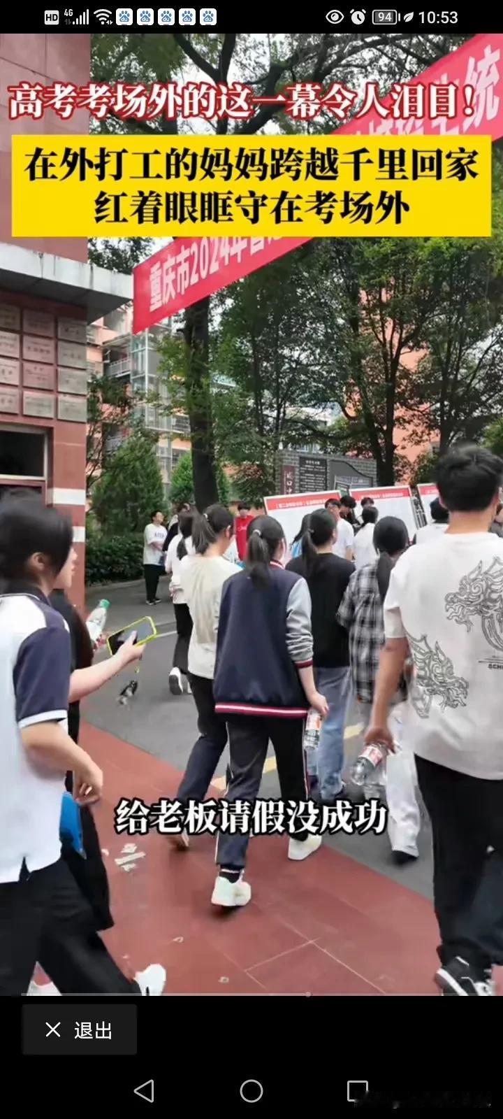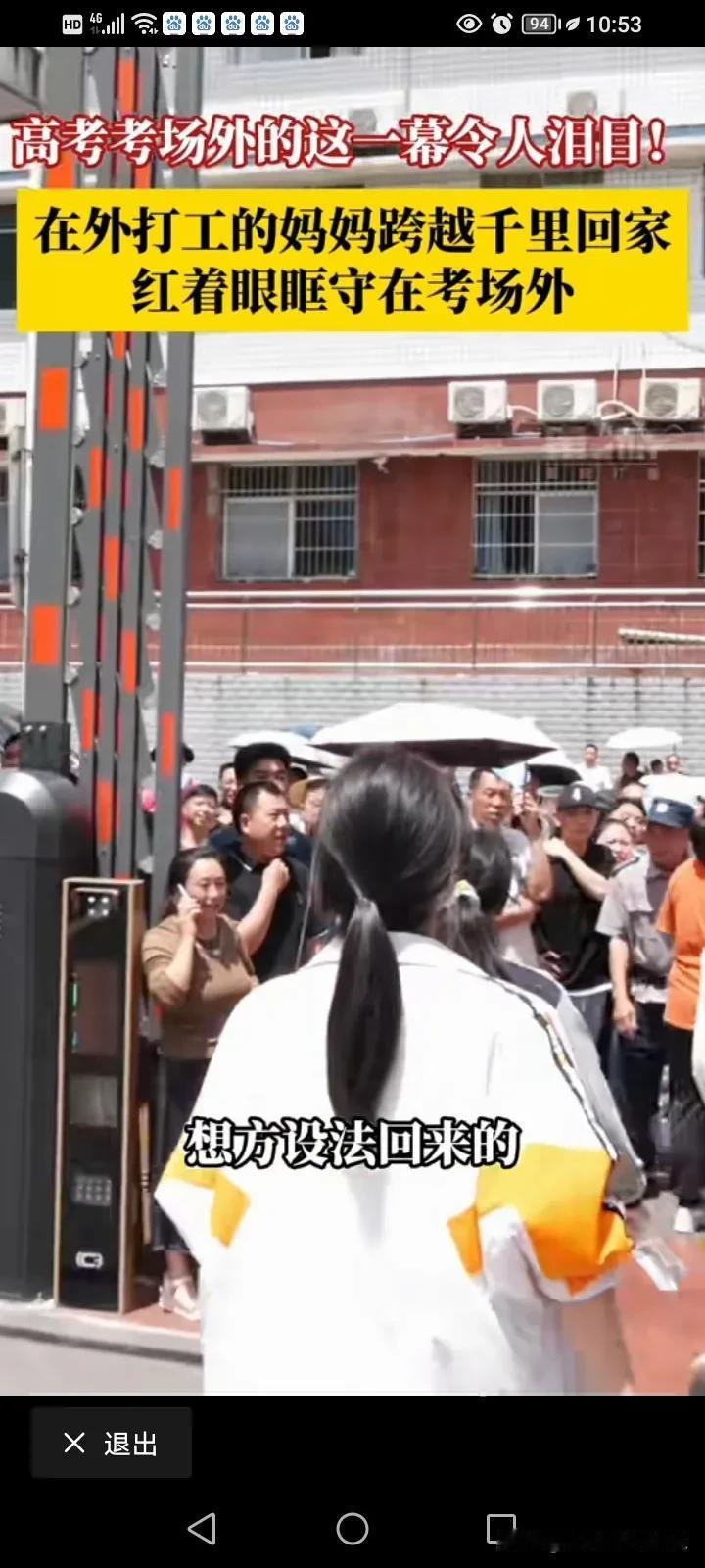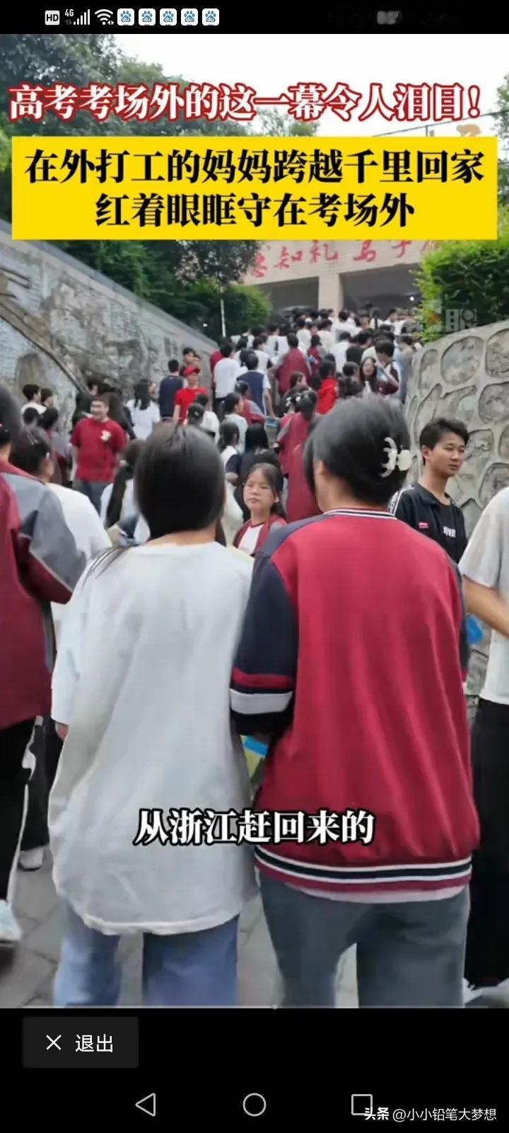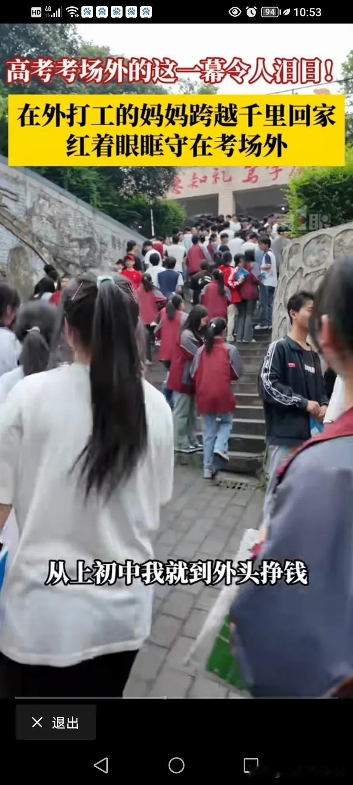 妈妈流着五味杂陈的泪水,我也看哭了…… 再远也想陪你奔赴梦想……重庆的高考场外一位妈妈令人泪目,孩子的妈妈跨越了千里,从浙江赶回了重庆,就是为了陪孩子,高考! 她说回来就是想要为他加油,她镜对着镜头流泪的说:“这几年你辛苦了,妈妈从你初中就开始出外打工挣钱,都没陪着你!” 孩子的妈妈从浙江赶回来,老板都没批假,她想方设法回来的,她觉得孩子人生中的一次高考,她不能缺席,所以特意赶回来给他一个惊喜,陪他奔赴梦想。 孩子妈妈说着说着就成泪人,那复杂的泪水,看的我很心酸,我想大部分的这给咱生活的家长都是这样的吧,哪个妈妈不想陪着孩子长大,但是也要为了生计啊,我太理解这个妈妈了,孩子辛苦,你也辛苦啦!