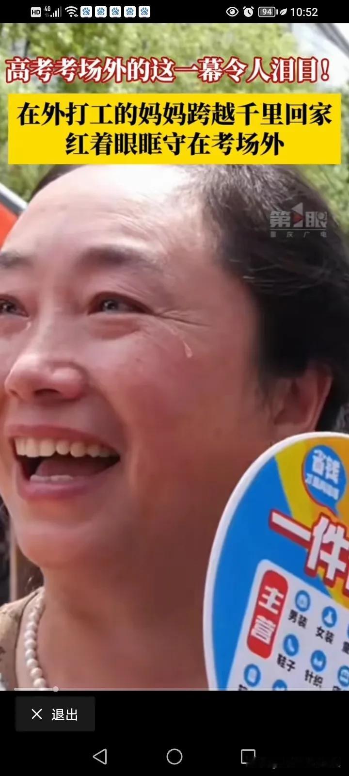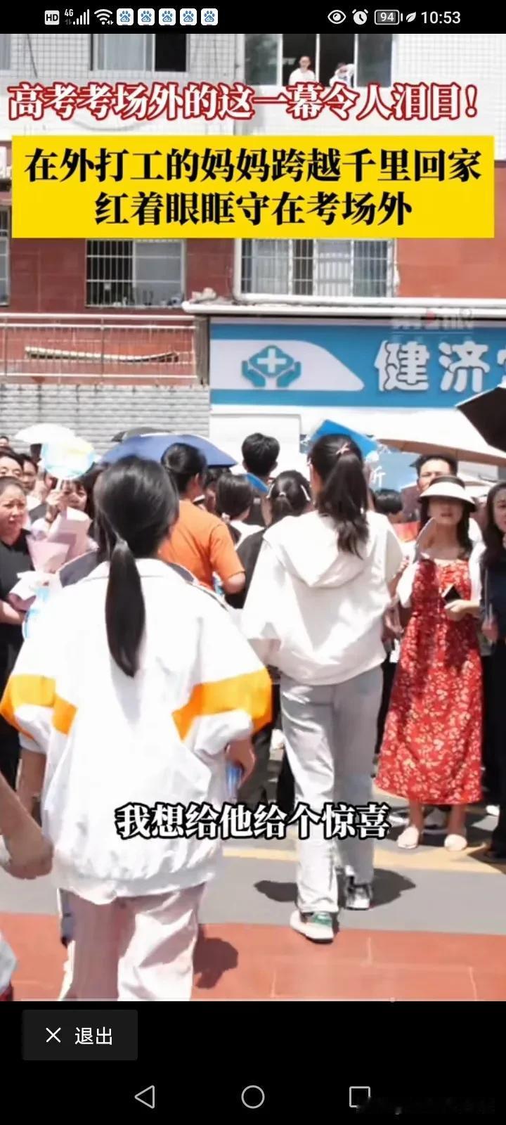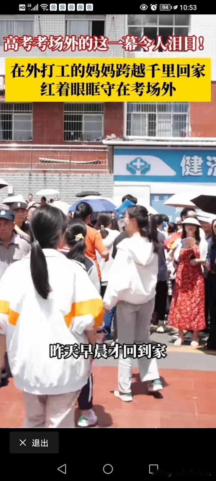 妈妈流着五味杂陈的泪水,我也看哭了…… 再远也想陪你奔赴梦想……重庆的高考场外一位妈妈令人泪目,孩子的妈妈跨越了千里,从浙江赶回了重庆,就是为了陪孩子,高考! 她说回来就是想要为他加油,她镜对着镜头流泪的说:“这几年你辛苦了,妈妈从你初中就开始出外打工挣钱,都没陪着你!” 孩子的妈妈从浙江赶回来,老板都没批假,她想方设法回来的,她觉得孩子人生中的一次高考,她不能缺席,所以特意赶回来给他一个惊喜,陪他奔赴梦想。 孩子妈妈说着说着就成泪人,那复杂的泪水,看的我很心酸,我想大部分的这给咱生活的家长都是这样的吧,哪个妈妈不想陪着孩子长大,但是也要为了生计啊,我太理解这个妈妈了,孩子辛苦,你也辛苦啦!