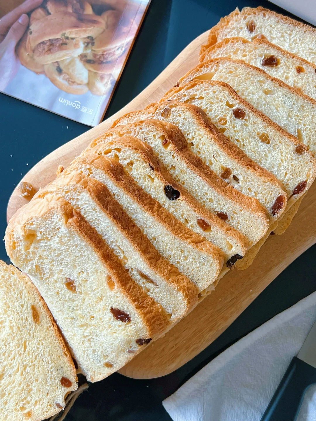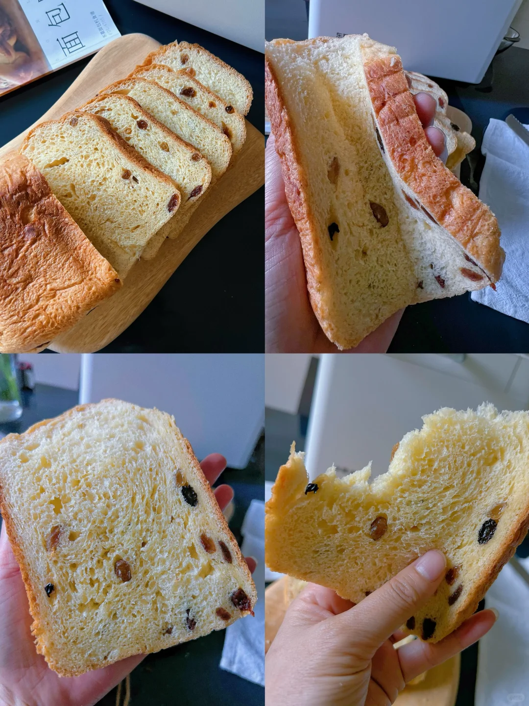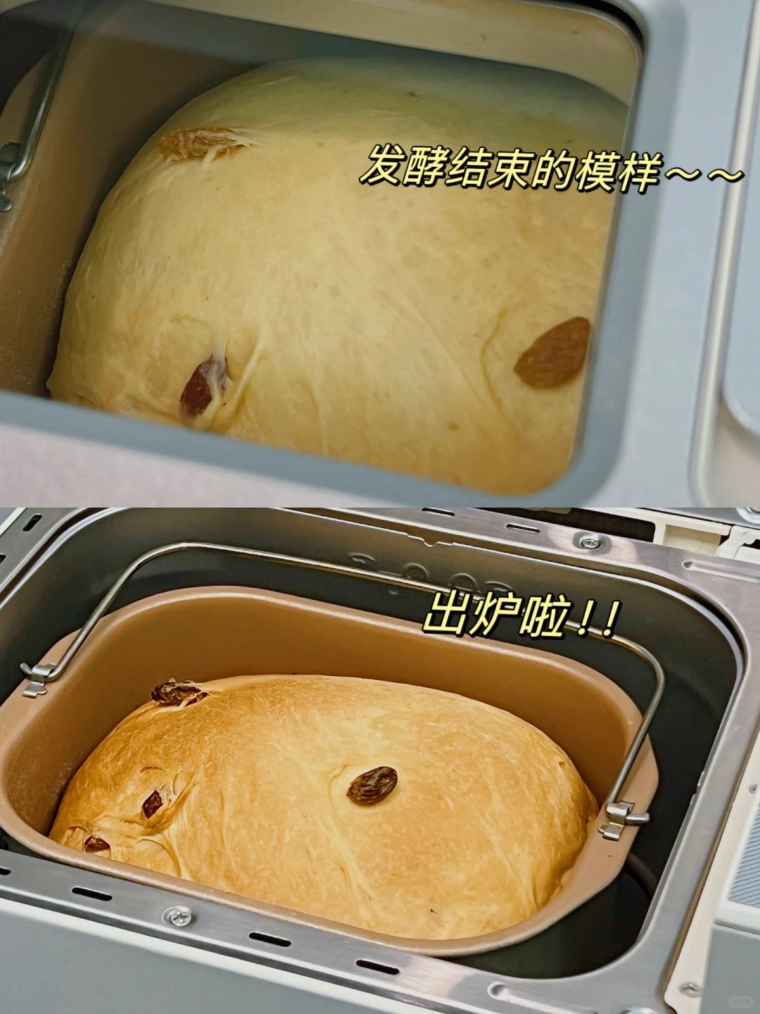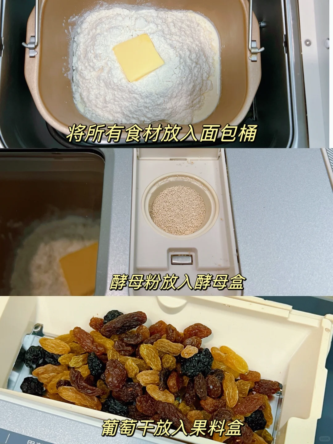 1️⃣将所有食材一一放入面包桶(盐和糖对角放),酵母粉放入酵母盒,葡萄干放入果料盒