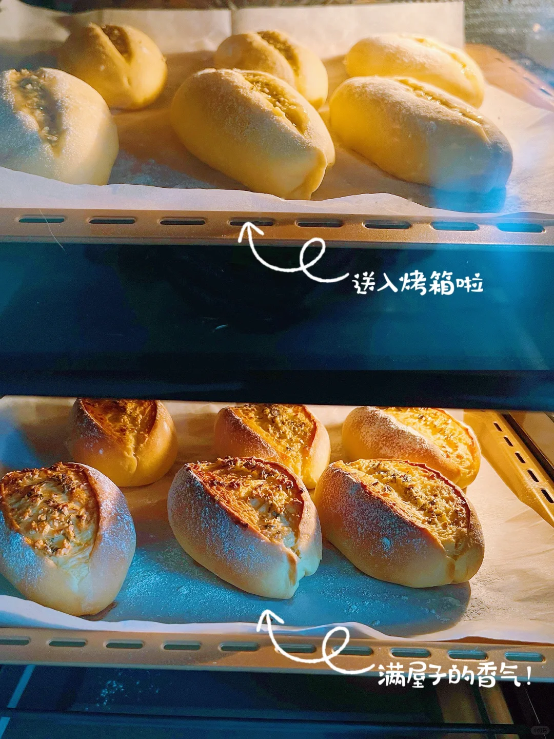 8️⃣发酵好,表面撒粉割口,挤入蒜香黄油酱(此时给烤箱预热,180度)