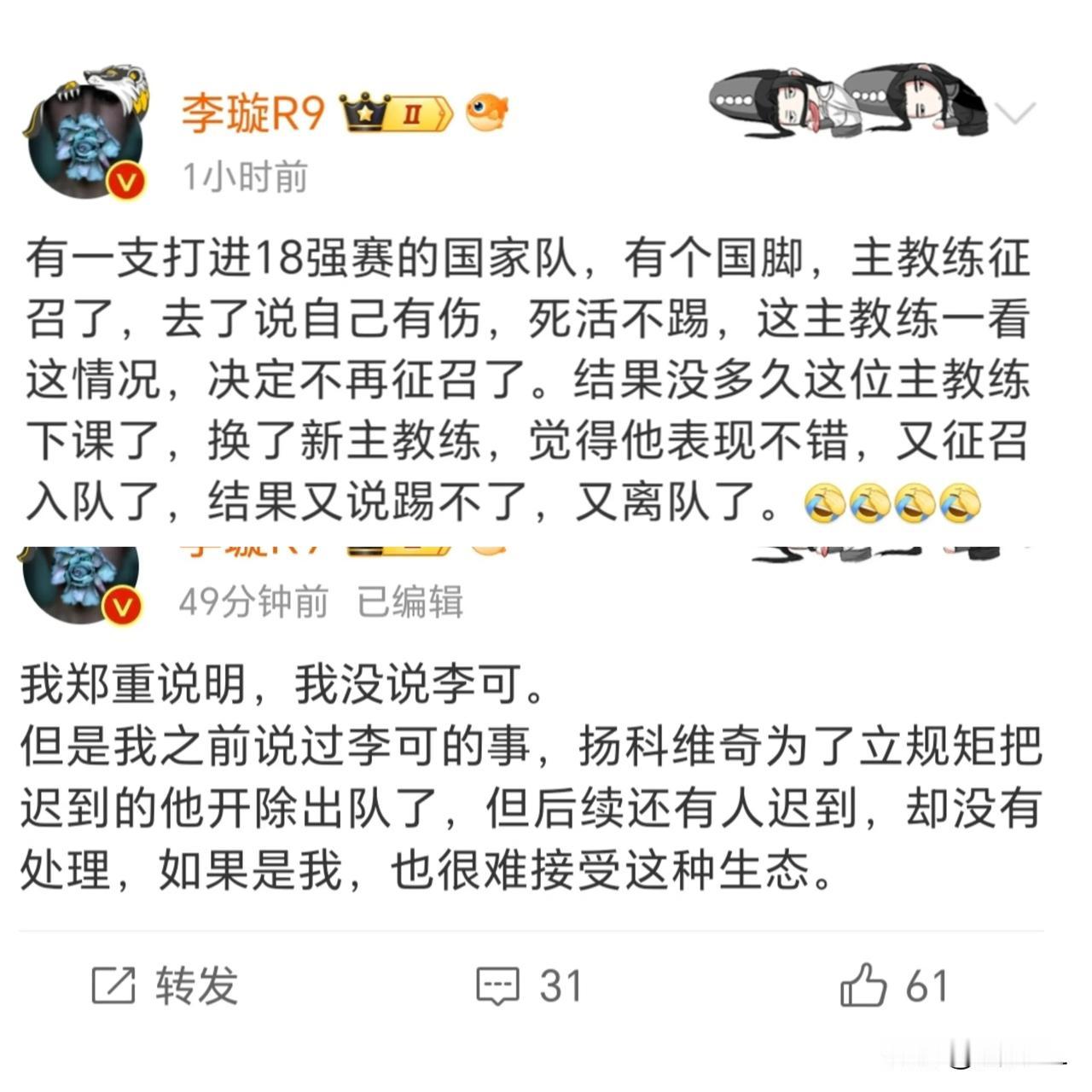 震惊!媒体人再爆惊人内幕,国家队危难之际还有如此操作? 如果球员真是诈伤逃避为国征战,这样的球员必须永远驱逐出国家队,虽说没有指明是谁,但看本轮中超登不登场就知道了,除非神医降临。 这样的球员相较于打封闭为国出战的球员,相较于为国征战而受伤的球员简直是天壤之别,根本就配不上职业球员的身份。