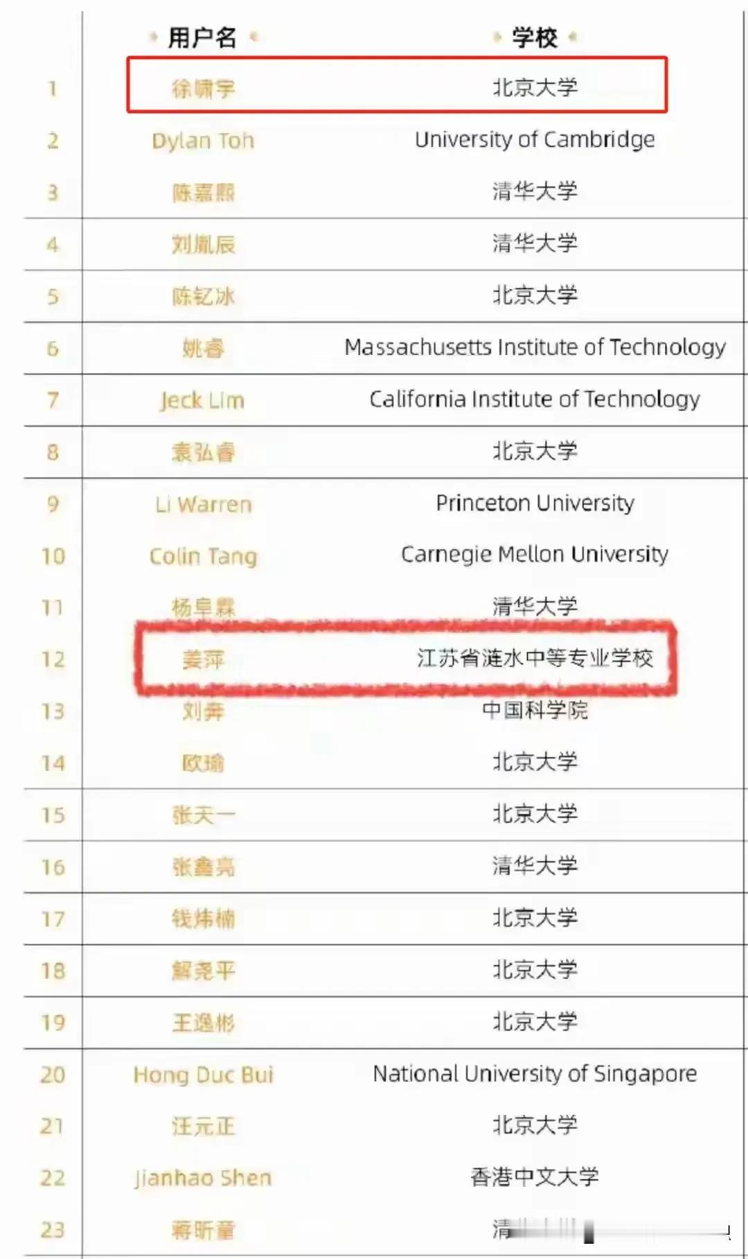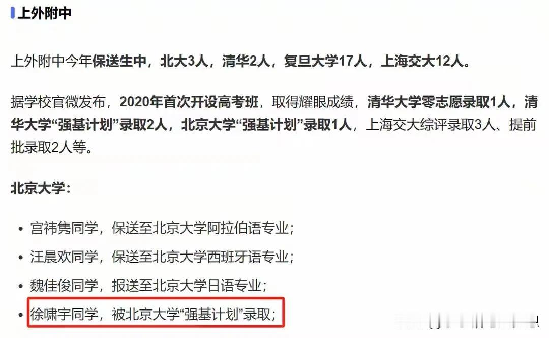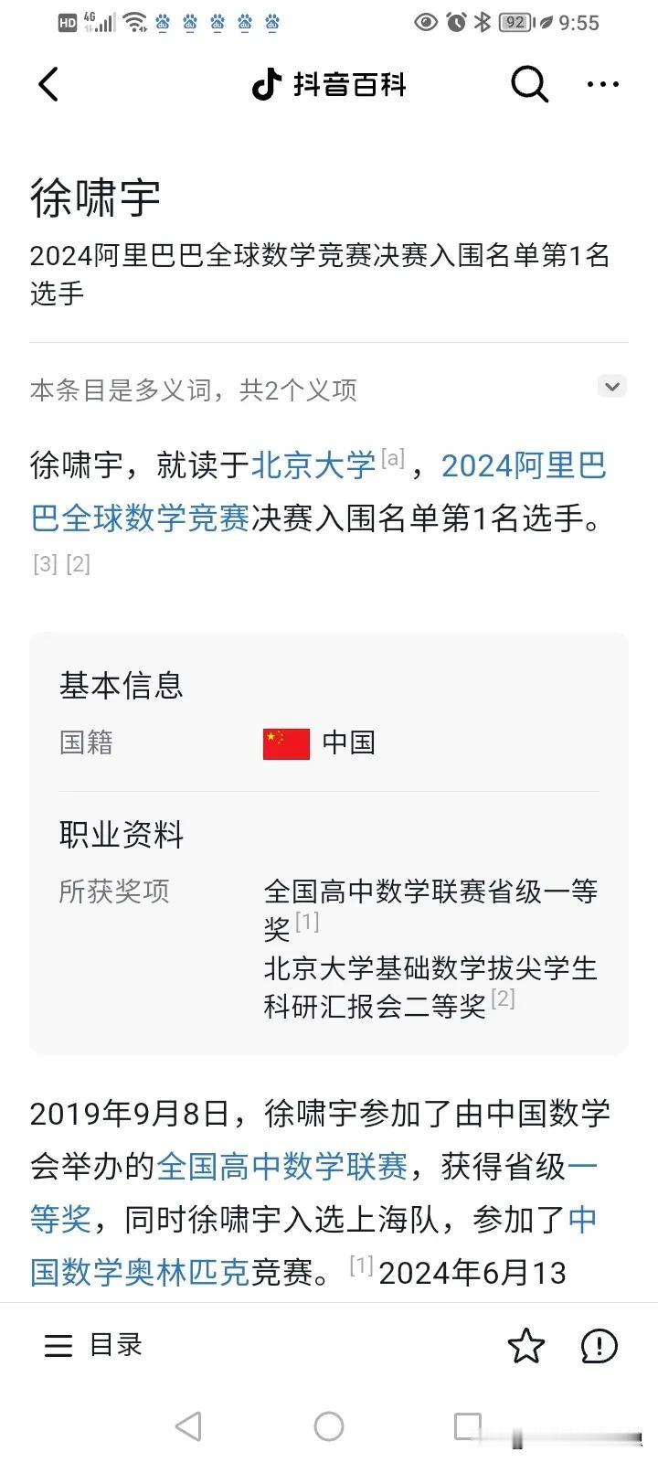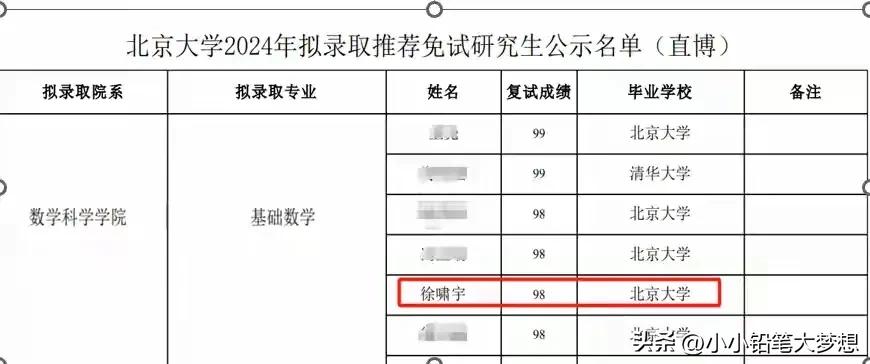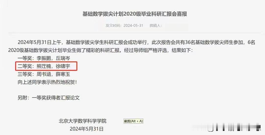 姜萍12名,徐啸宇:“我才是第一名啊,怎么没有人多看我一眼?”被大家忽略的徐潇宇,他到底有多优秀?这几天都被17岁在中专生姜萍霸屏了。 而位列第一名的徐啸宇几乎无人提及,或许大家觉北大清华本来数学就是数一数二的,他本就读于北京大学,拿个第一没有什么惊喜吧? 徐啸宇高中就读于名校,上海外国语附中,高一才认真学习数学,2019年9月8日,高三的他参加了中国数学全国高中联赛,获得了省一级一等奖,然后入选上海队,就获得第35届全国中学生数学奥林匹克银牌。 2020年,被北京大学“强基计划”录取。 2023年,获得丘成桐大学数学竞赛总决赛个人单项赛陈省身奖(几何与拓扑方向)银奖。 2024年,他再次杀回来,参加第十五届丘成桐大学生数学竞赛,可是这一次略差一点得铜奖。 2024年5月31日,徐啸宇在北京大学基础数学2020级毕业拔尖学生科研汇报会上获得二等奖。 2024年,徐啸宇北大本科毕业已被推荐免试北京大学数学科学学院基础数学直博资格。 2024年6月13日,徐啸宇获得2024阿里巴巴全球数学竞赛决赛入围名单的第一名。 他这一路走来,真是扶摇直上! 预赛能拿第一名的,这实力不容小觑啊,6月22号的决赛也是势在必得了! 姜萍想要脱颖而出,直冲3可能比较呛了!不过一个是17岁中专生自学成才,是业余选手。 一个从小到大家长极力培养,是专业的比赛型选手两者没有可比性。 姜萍能通过自学能进入决赛,可想而知天赋异禀。 不管决赛成绩怎样,后期如姜萍果能在专业老师给予培养和引导,前途无可限量,绝对能成为是国家级的人才,我们拭目以待!