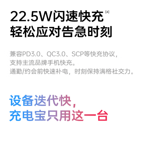 这款充电宝在续航能力上表现良好,配备了10000毫安容量电池,能够满足我们一天的电量使用需求,比较适合日常外出时携带。并且这款还具有出色的充电性能,支持22.5W的主流功率,轻松为手机补充足够的电量,外出时携带这一款充电宝即可消除电量焦虑。此外,它有着自带双线、智能屏显设计,即使忘记戴充电线也不用担心,同时还可以随时知道剩余电量,没有移动电源电量不足的尴尬情况,这些功能还是比较实用的。
