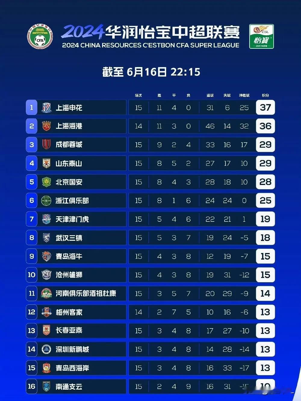 FIFA病毒?中超第15轮,两支国脚大户上海申花、山东泰山均与对手战平。 山东泰山客场0:0闷平梅州客家,但老对手北京国安更加拉胯,客场1:2不敌河南,缓解了南基一的下课危机,同时积分也被泰山队反超。 上海申花看似仍排名积分榜第一,但身后的上海海港经过补赛以后,不出意外将锁定半程冠军。