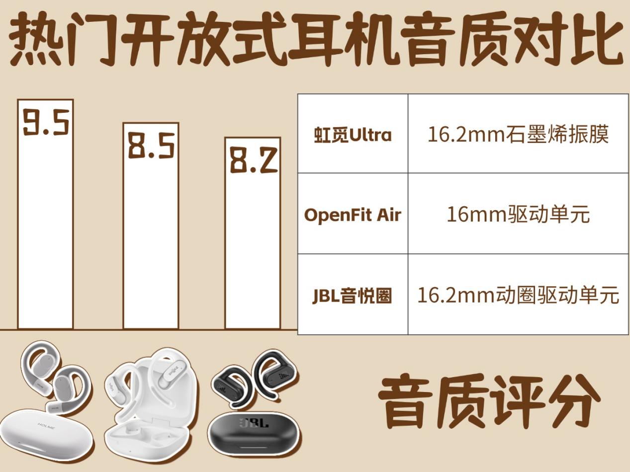 现在开放式耳机热度越来越高,款式也越出越多,很多朋友挑的时候都犯难,不知道到底哪款才真正适配自己。我在耳机圈摸爬滚打这么多年,今儿就给大家整理了三款当下热门的开放式耳机,分别是虹觅 Ultra、韶音 OpenFit Air还有JBL音悦圈,把它们各项核心参数都扒透了做个详细对比,给大家选品当个靠谱参考,感兴趣的朋友就接着往下看。