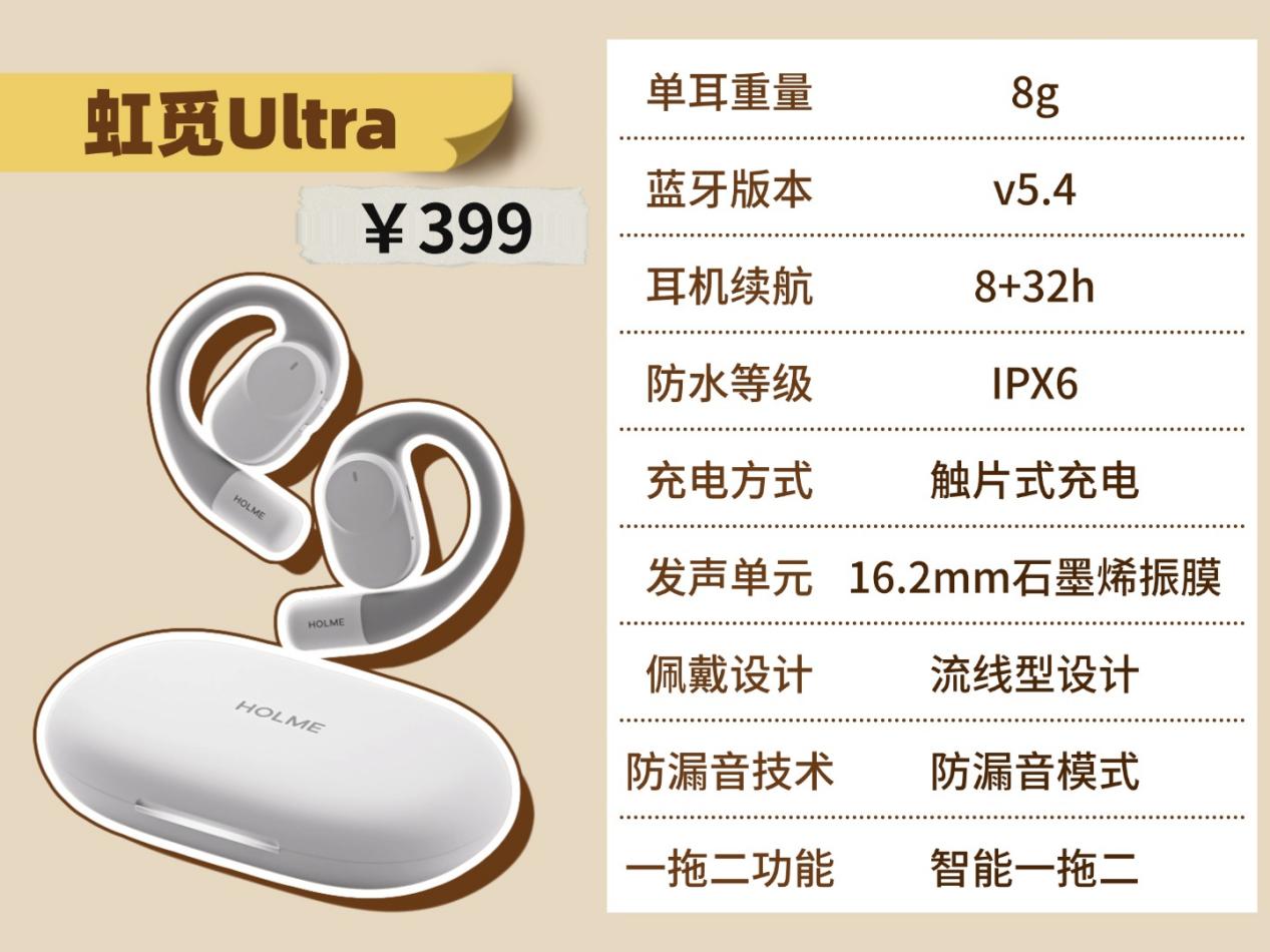 虹觅Ultra:在音质上,它搭载了16.2mm大动圈,驱动力拉满,不仅音量够劲,音质整体饱满扎实;振膜用的是石墨烯材质,能精准还原声音里的各种小细节;再加上虹觅声学实验室的高保真调音,整体听感细腻度直接拉满,细节满满,在500元价位里这款耳机的音质可以达到TOP3级别。
