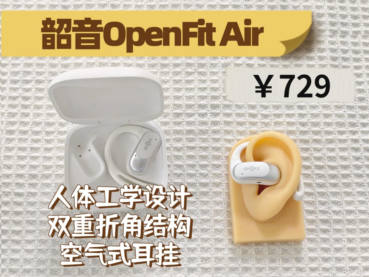 韶音 OpenFit Air:这款耳机采用人体工学设计,与耳部贴合度很高,搭配双层,触感亲肤又舒适。单耳仅8.7g的重量十分轻盈,长时间佩戴也能保持舒适体验。不过它对耳形略有要求,大耳朵佩戴可能会有夹耳感,更适合耳形偏小的人群使用。