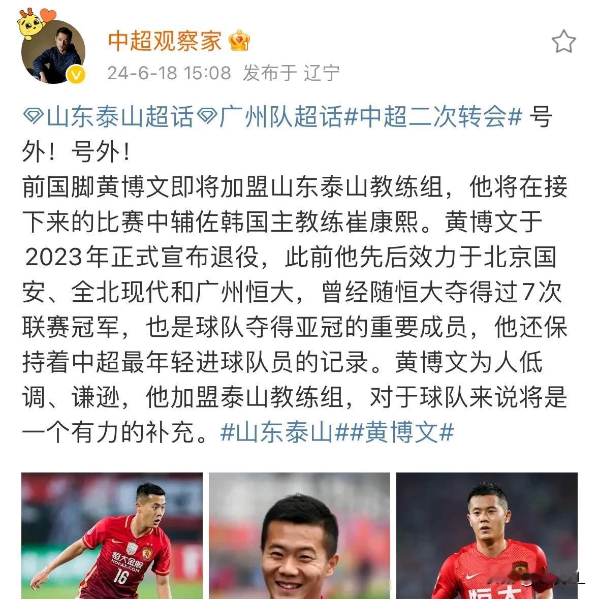 意料之外的“后腰”新援,山东泰山夏窗第一签!这又是崔康熙的要得吧? 盼星星盼月亮,泰山球迷期待的“腰子”终于来了,不过他不是以球员的身份来到球队。媒体人爆料,原恒大功勋球员黄博文即将加盟山东泰山教练组,辅佐韩国教头崔康熙。 值得注意的是,球员时代的黄博文的确是国内一流后腰球员。
