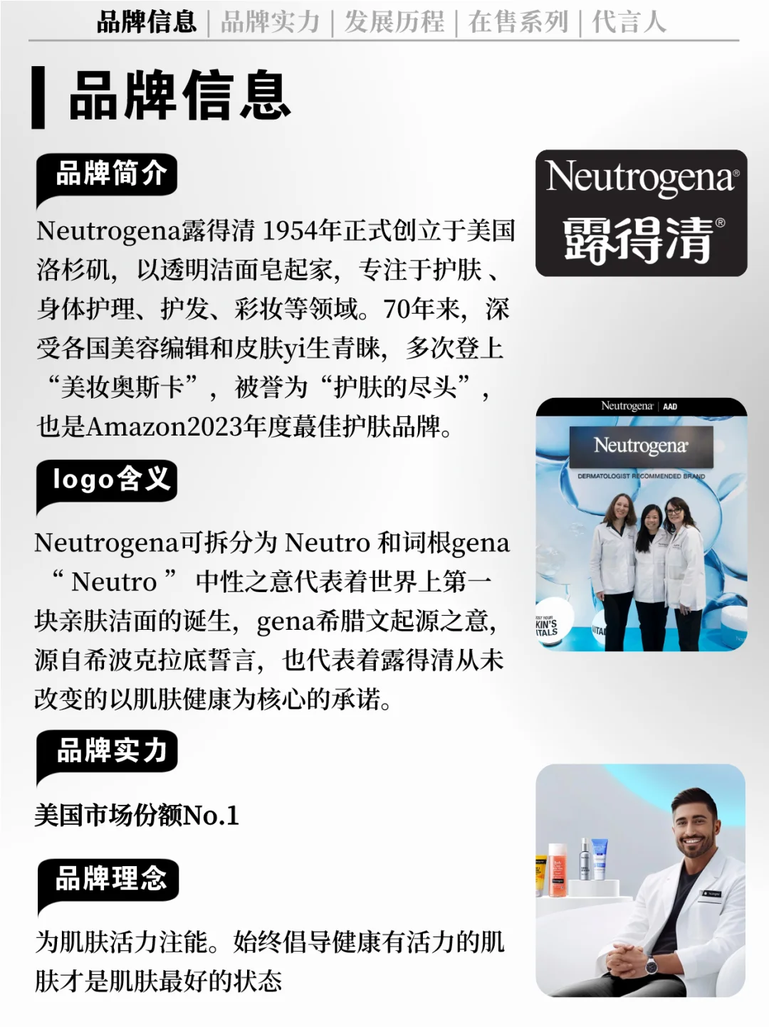 [向右R] 品牌简介:Neutrogena露得清 1954年正式创立于美国洛杉矶,以透明洁面皂起家,专注于护肤、身体护理、护发、彩妆等领域。70年来,深受各国美容编辑和皮肤yi生青睐,多次登上“美妆奥斯卡”,被誉为“护肤的尽头”,也是Amazon2023年度蕞佳护肤品牌。