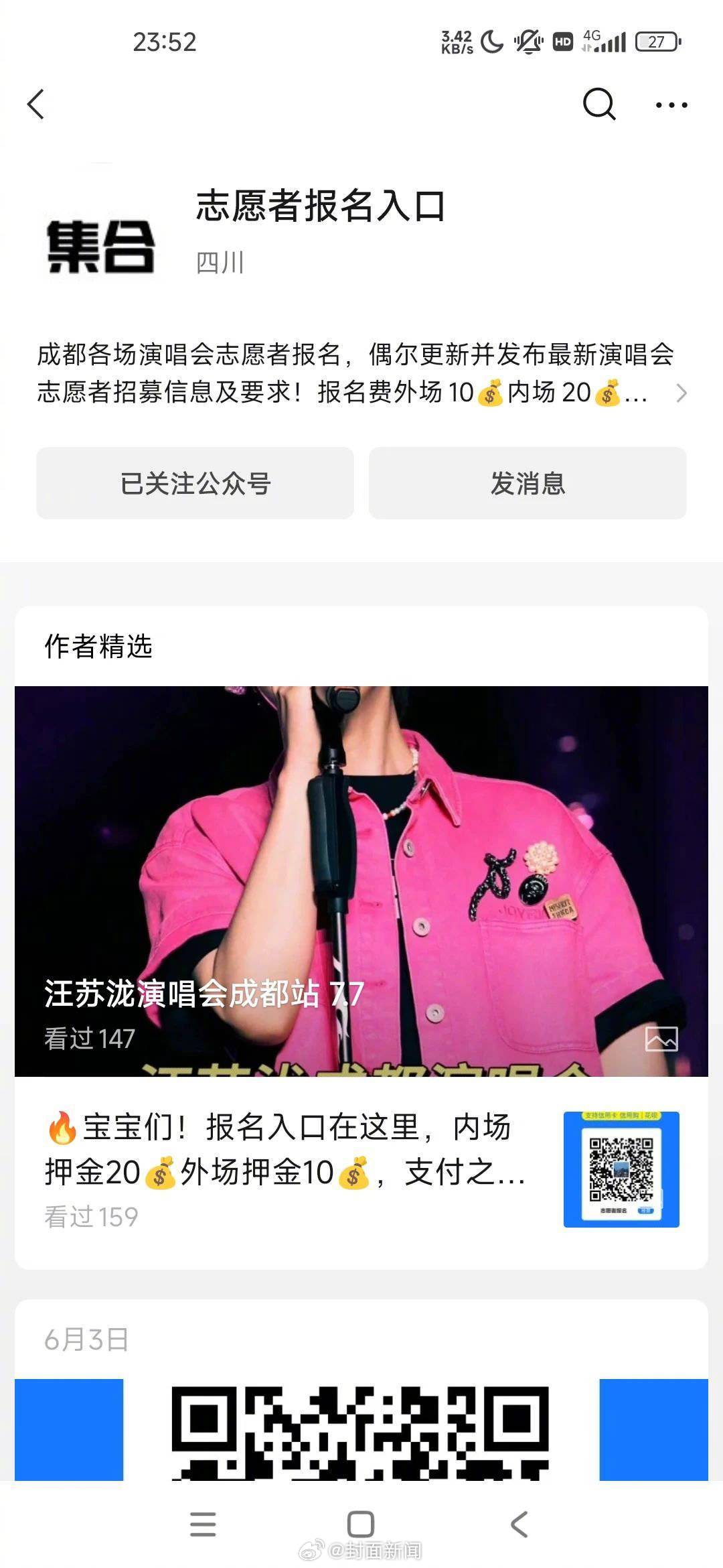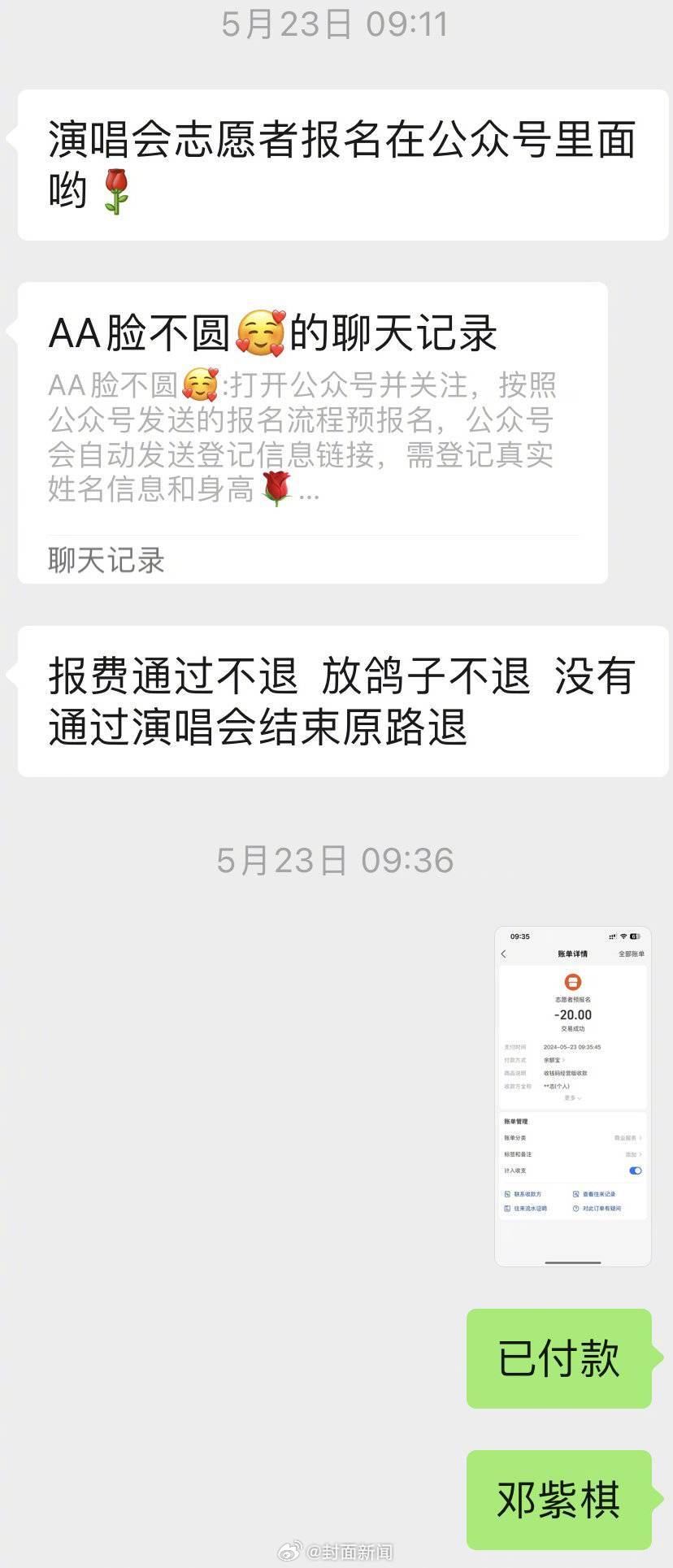 【#付费报名演唱会志愿者结果被套路# 当事人:报名人数每场都在百人左右】6月1-2日,G.E.M.邓紫棋 I AM GLORIA世界巡回演唱会成都站开演。抢不到门票的小雨决定换一个思路:报名演唱会志愿者入场。然而,支付了报名费,填报了报名信息后,“招募方”失联了。和小雨一样,被套路的消费者还不少。“报名名单里,有五六场演唱会,每场都有上百人。”小雨认为,虽然10-20元的报名费不多,但防不胜防的套路,却让她不太好受。记者联系上了邓紫棋成都演唱会主办方成都凡人歌文化传播有限公司。一位工作人员回应称:“我们公司没有招聘过志愿者。”