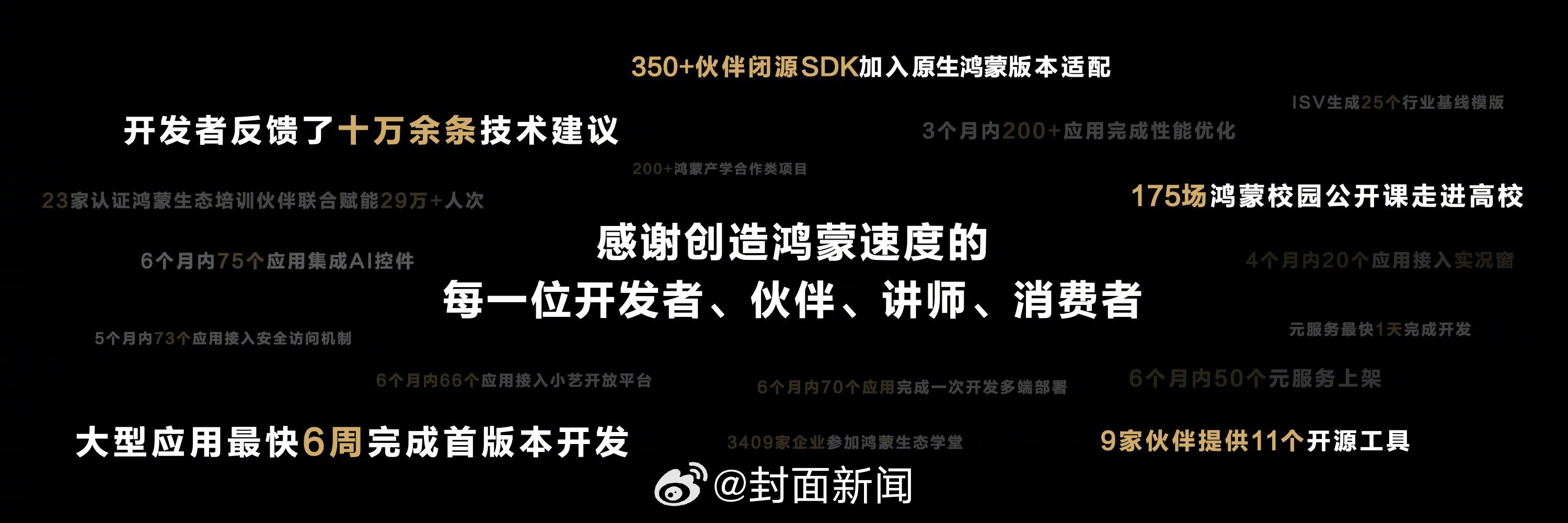 #余承东称加入鸿蒙正当时#今日,华为开发者大会上,来自新华社、去哪儿、航旅纵横等数十家伙伴代表齐聚一堂,共同见证鸿蒙生态的最新进展。目前,余承东宣布鸿蒙生态设备数量已突破9亿大关,头部5000多个应用已经全部启动鸿蒙原生应用开发,1500+应用已上架华为应用市场。这样的鸿蒙速度离不开每一位开发者、伙伴、讲师和消费者的支持。#余承东感谢创造鸿蒙速度的每个人#星河璀璨,余承东期待更多伙伴成为鸿蒙的时代合伙人,与华为共创鸿蒙蓝图。