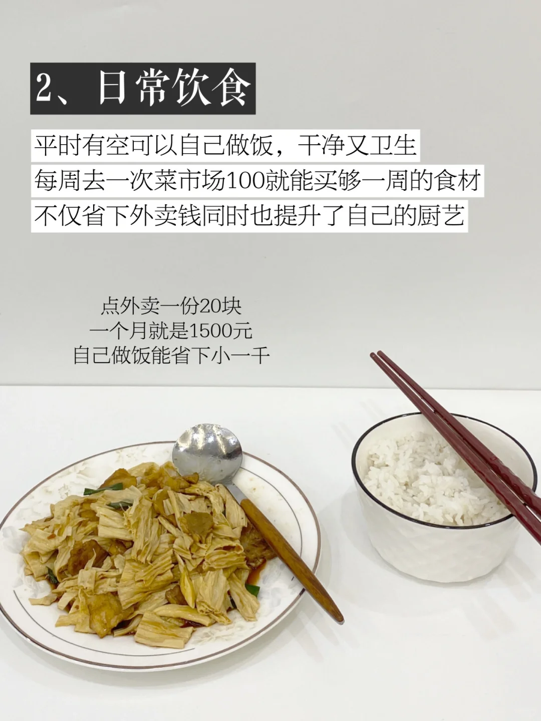 少点外卖,平时有空可以自己做饭,干净又卫生,每周去一次菜市场100就能买够一周的食材,不仅省下外卖钱同时也提升了自己的厨艺