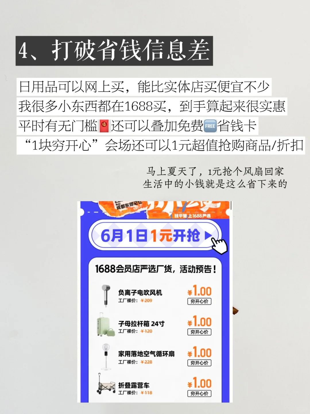我的一些生活小东西都会在1⃣️6⃣️8⃣️8⃣️买,有无门槛🧧还可以叠加免费省钱卡,一个月下来能省下三五百,61在1688的“一块穷开心”活动会场一元就还可以1元超值抢购活动商品,当天还有“1688穷开心之夜”,超多好物能抢