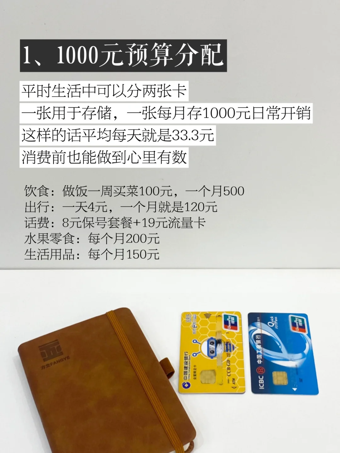 平时生活中可以分两张卡,一张用于存储一张每月存1000元用于日常开销,这样的话平均每天就是33.3元,消费前也能做到心里有数