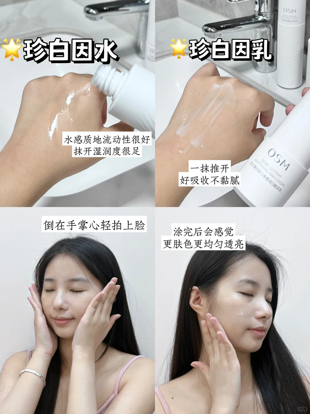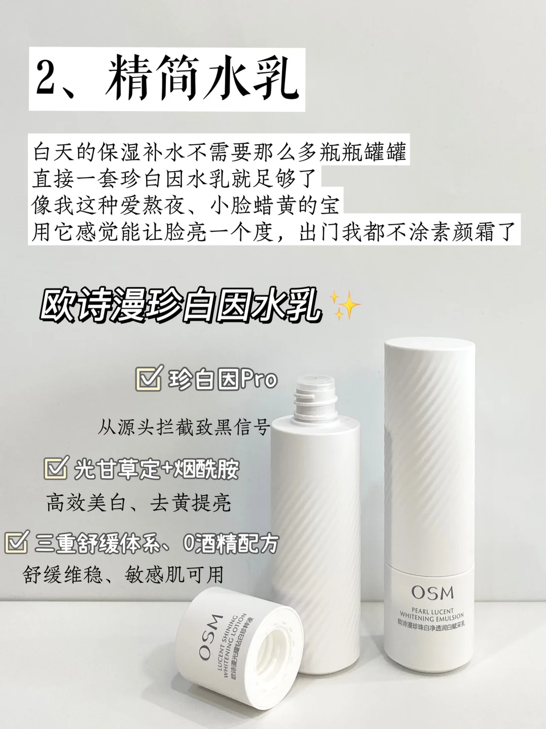 试了一圈留下了👉欧诗漫珍白因水乳,选它很大部分是因为同等价位上,它的保湿提亮效果✨真的没话说,用了一个月,我现在出门连素颜霜都不用涂了,感受到了什么叫脸蛋像“剥壳🥚”~