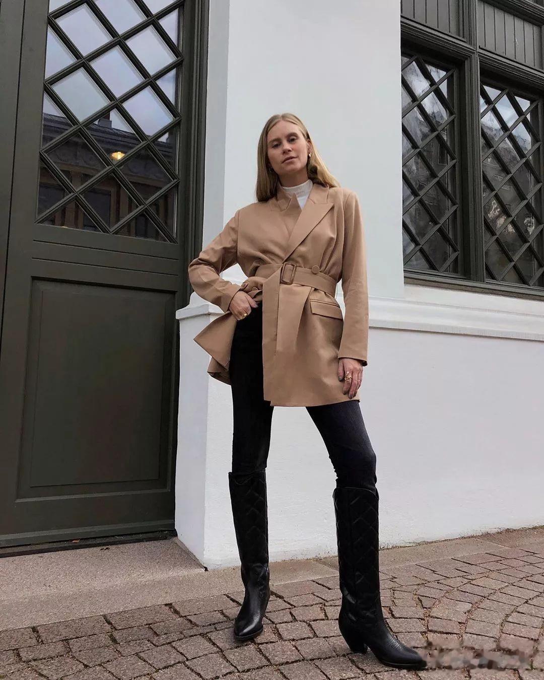 一条与长靴颜色呼应的腰带,不仅能提高腰线优化比例,还能增强整体感;选择与靴子材质相似的包包(如皮质长靴配皮包),能提升造型的精致度。