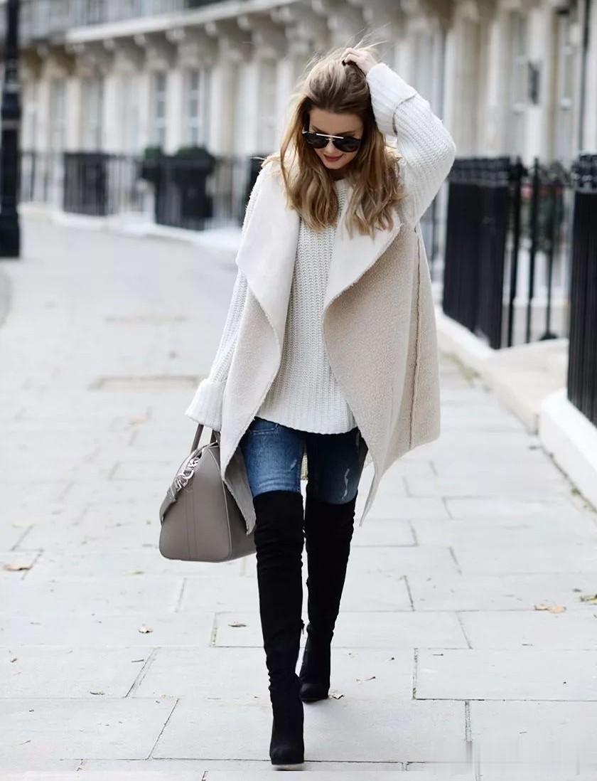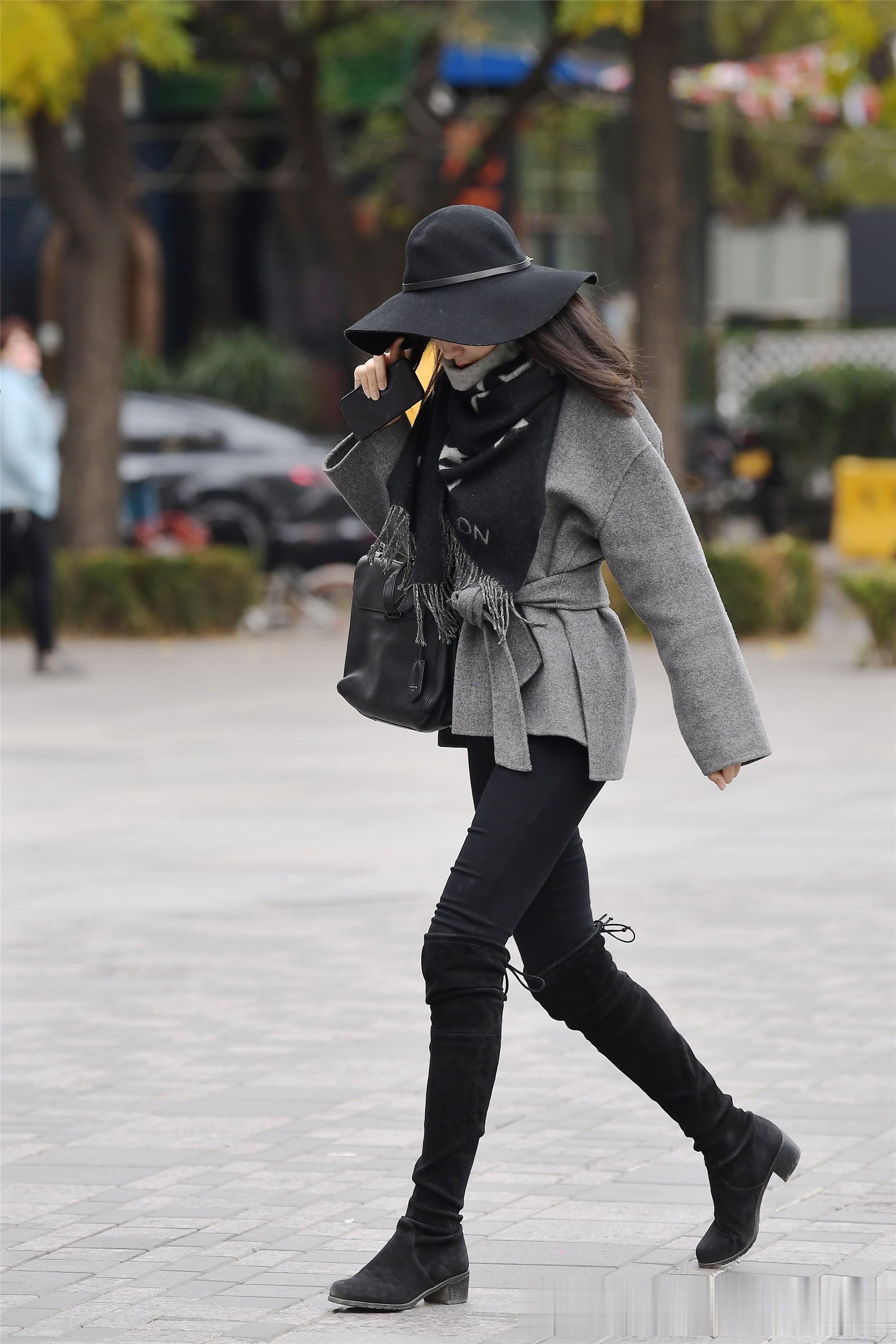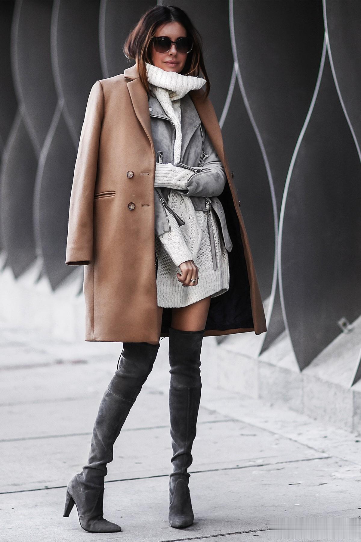 这种搭配最迷人的地方在于它打破了“长靴只能搭配短装”的刻板印象。一件及膝的针织连衣裙,配上一双贴合腿部线条的过膝靴,无需裸露过多皮肤,便能散发含蓄而高级的女性魅力。