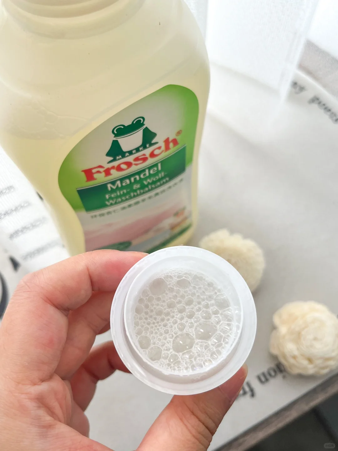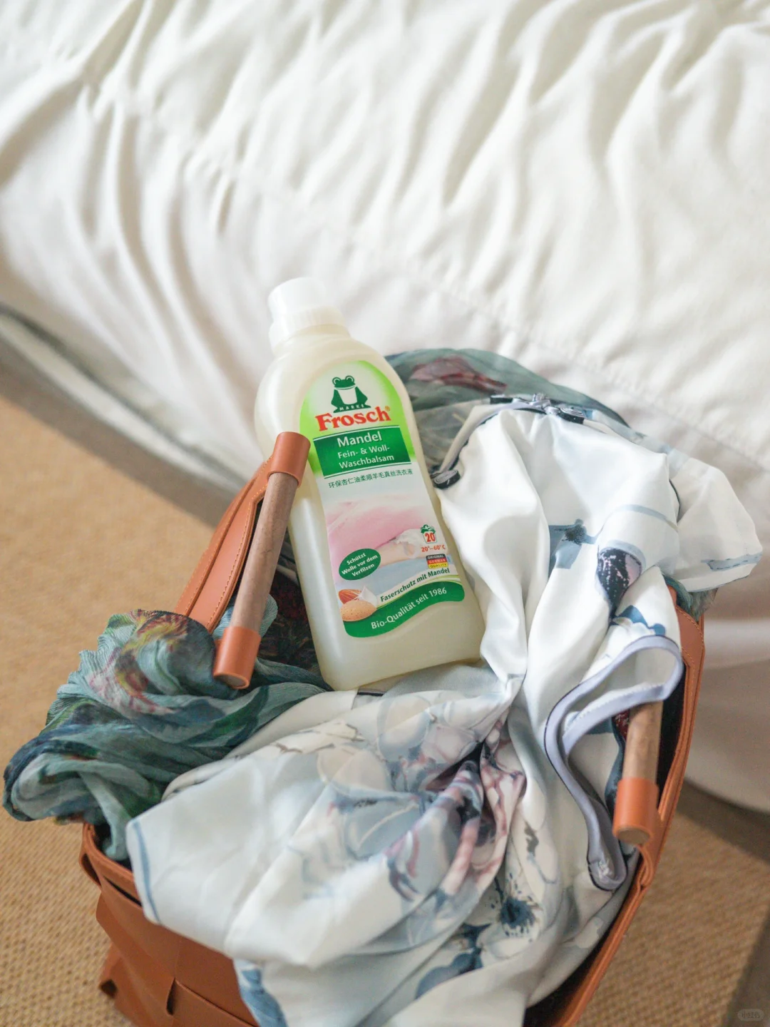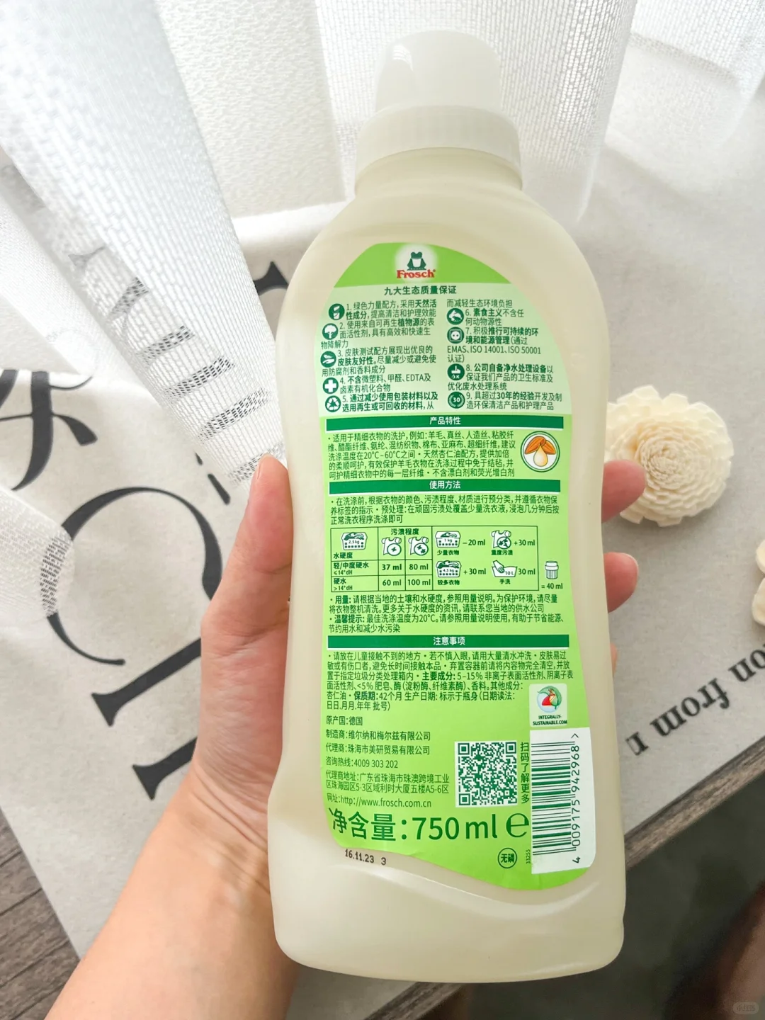 Frosch羊毛真丝洗衣液添加了杏仁油配方,温和护手,保护面料细腻光滑,洗出来的衣物柔软服帖,冬天用来洗羊绒不会缩水