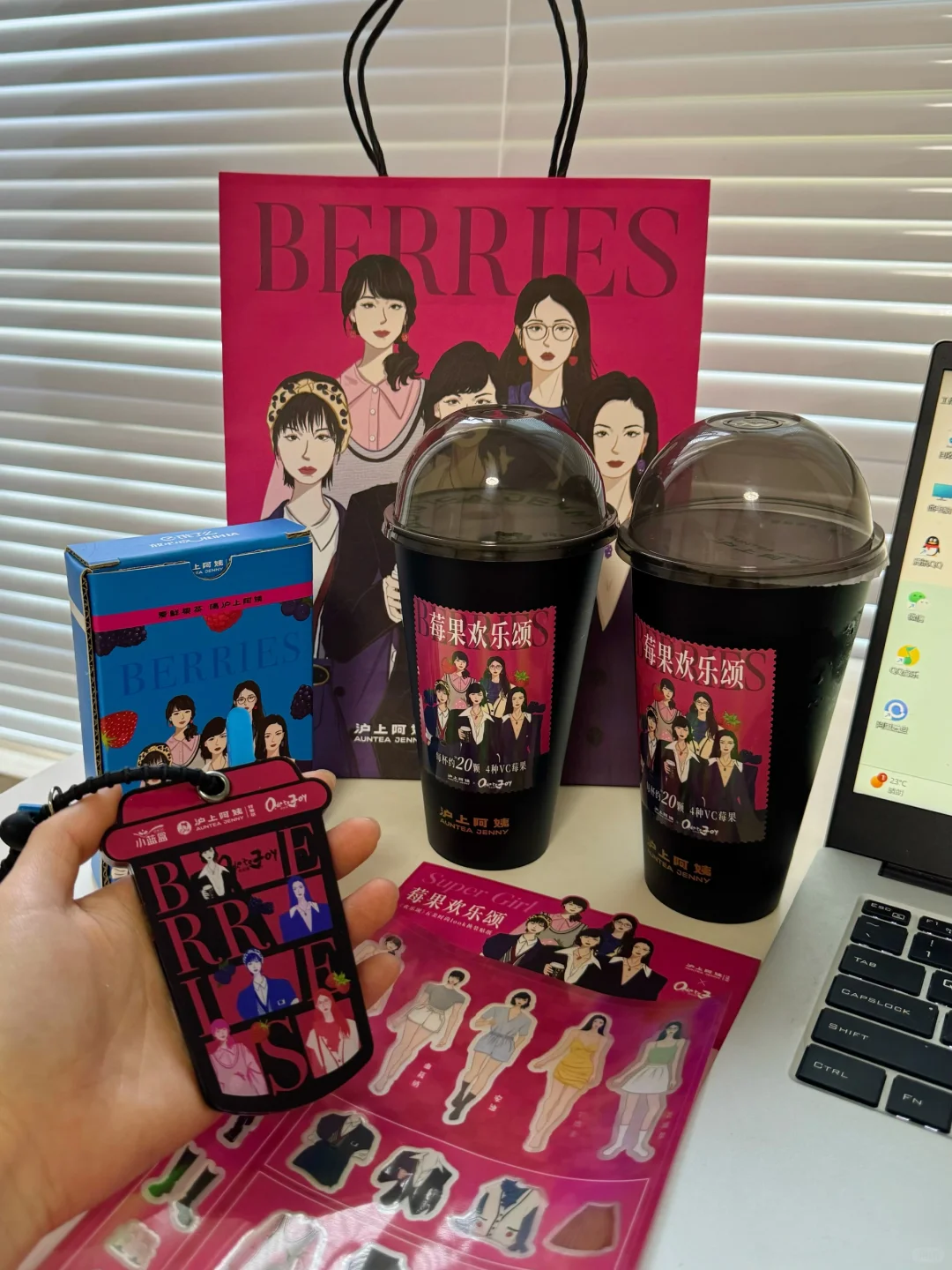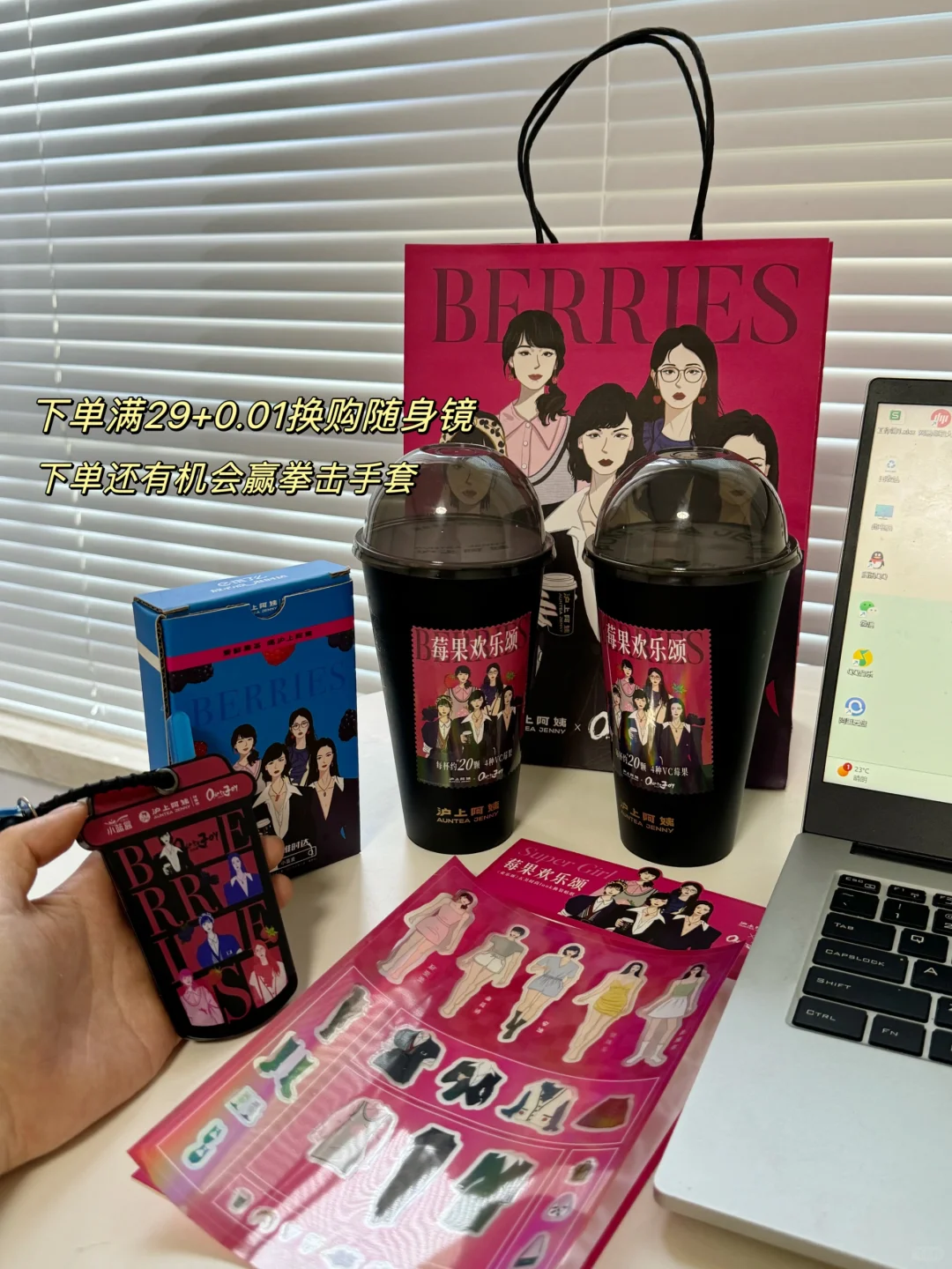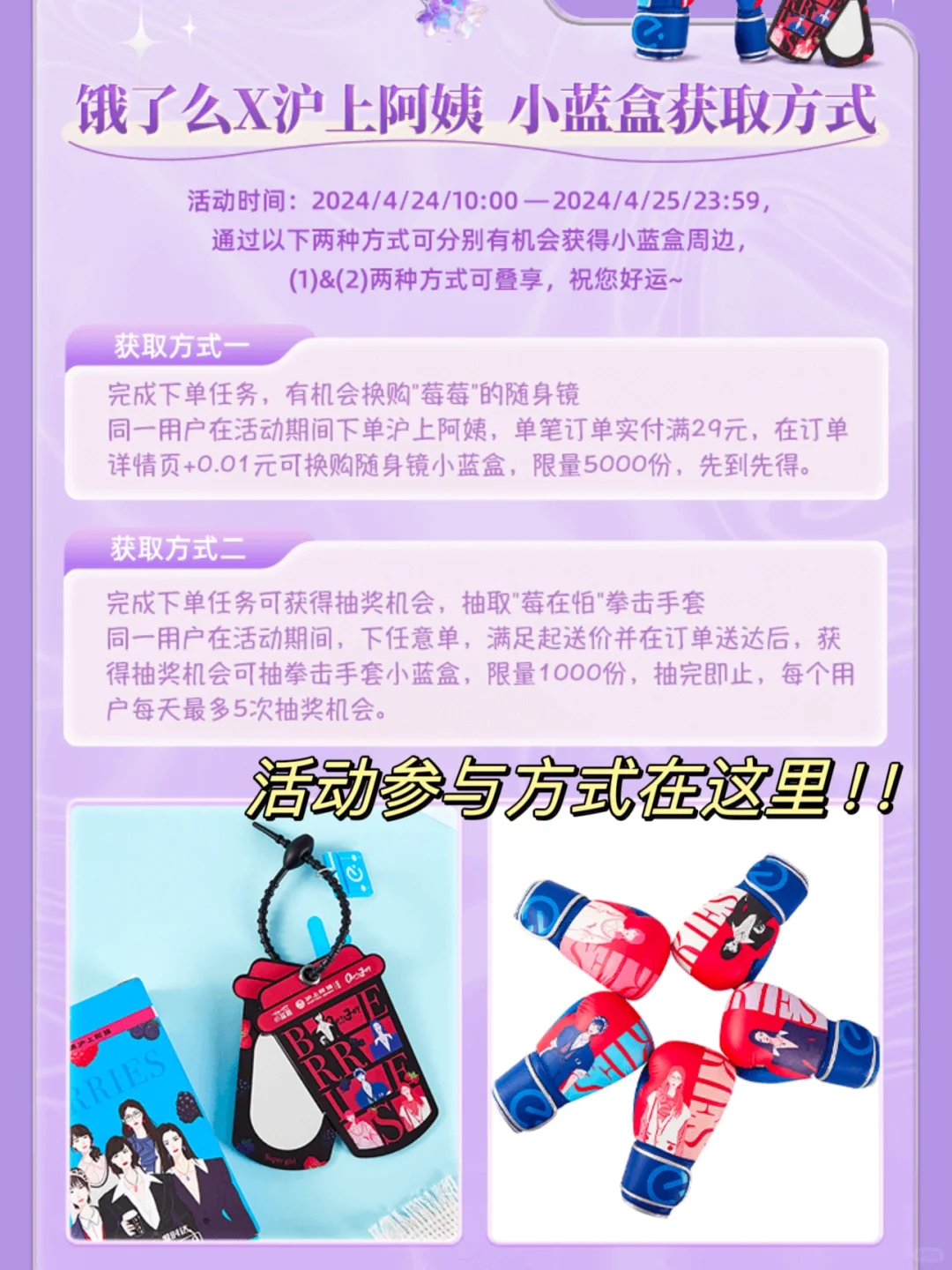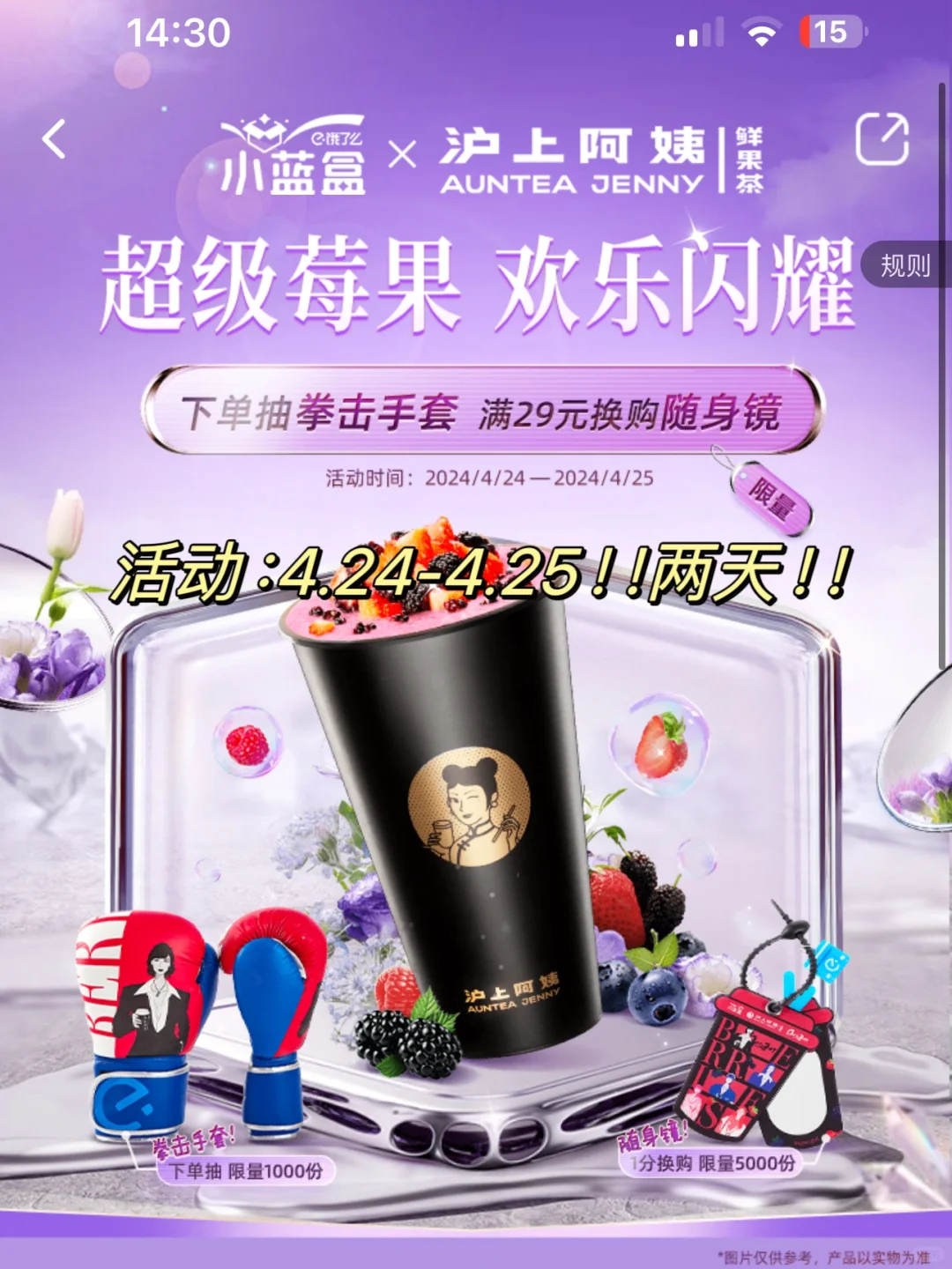 哇!我发现越来越多的女生都变自信啦 无视他人眼光!做傲于高墙上的凌霄花! 这真的太让人开心了! 毕竟这个世界不能没有女孩子~ - 就是我今天和同事在饿了么点奶茶 发现沪上阿姨和欢乐颂联名啦 有4款酸甜森林莓果搭配超级酸奶 一杯就有20颗莓果!花青素含量拉满! - 该说不说饿了么一直送达挺准时的 拿到的时候发现送了好多周边 居然是拳击手套和小蓝盒镜子! (这个是只有在饿了么点沪上阿姨才有哦) - 镜子是奶茶杯的造型 背面还是沪上阿姨的logo~ 小巧可爱~我和同事就一直在照呀照 边照边说“我也tai莓丽了吧!” - 你看~女生还是灰常喜欢欣赏自己的美貌滴 越照越觉得我俩好好看呀~ 尊嘟像欢乐颂一样 欢乐闪耀,魅力无限呢~ - 对对对!大家记得去【饿了么】搜索 “沪上阿姨小蓝盒” 然后就可以进入会场抽奖啦! 愿大家都能越高山,也悦己心