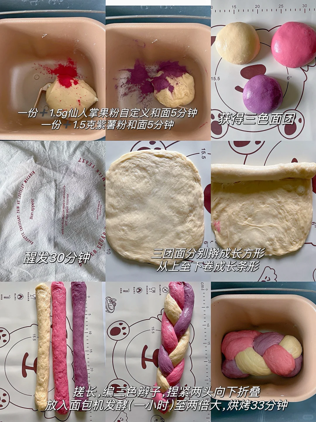 4️⃣三团面分别擀成长方形,从上至下卷成长条形搓长,编三色辫子,捏紧两头向中间折叠,正面朝上放入面包机发酵(一小时)至两倍大,烘烤33分钟