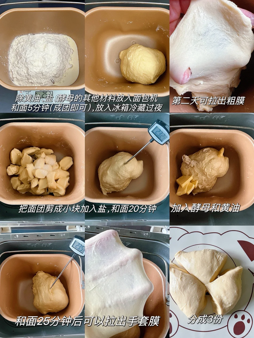 1️⃣除了黄油、盐、酵母的其他材料放入面包机,和面5分钟(成团即可),放入冰箱冷藏过夜