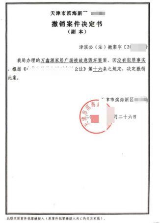 2021年4月29日,天津市滨海新区执法机关以“故意毁坏财物罪”对马某阳、陈某虎采取立案侦查,但案件推进却步履维艰 —— 主要犯罪嫌疑人马某泉始终未被采取强制措施。更令人无法接受的是,2022年1月,在一审法院以 “姜新红丧失商场实际控制权” 为由判决解除租赁合同后,二审法院未开庭审理的情况下,滨海新区执法机关以 “无犯罪事实” 为由,撤销该案。