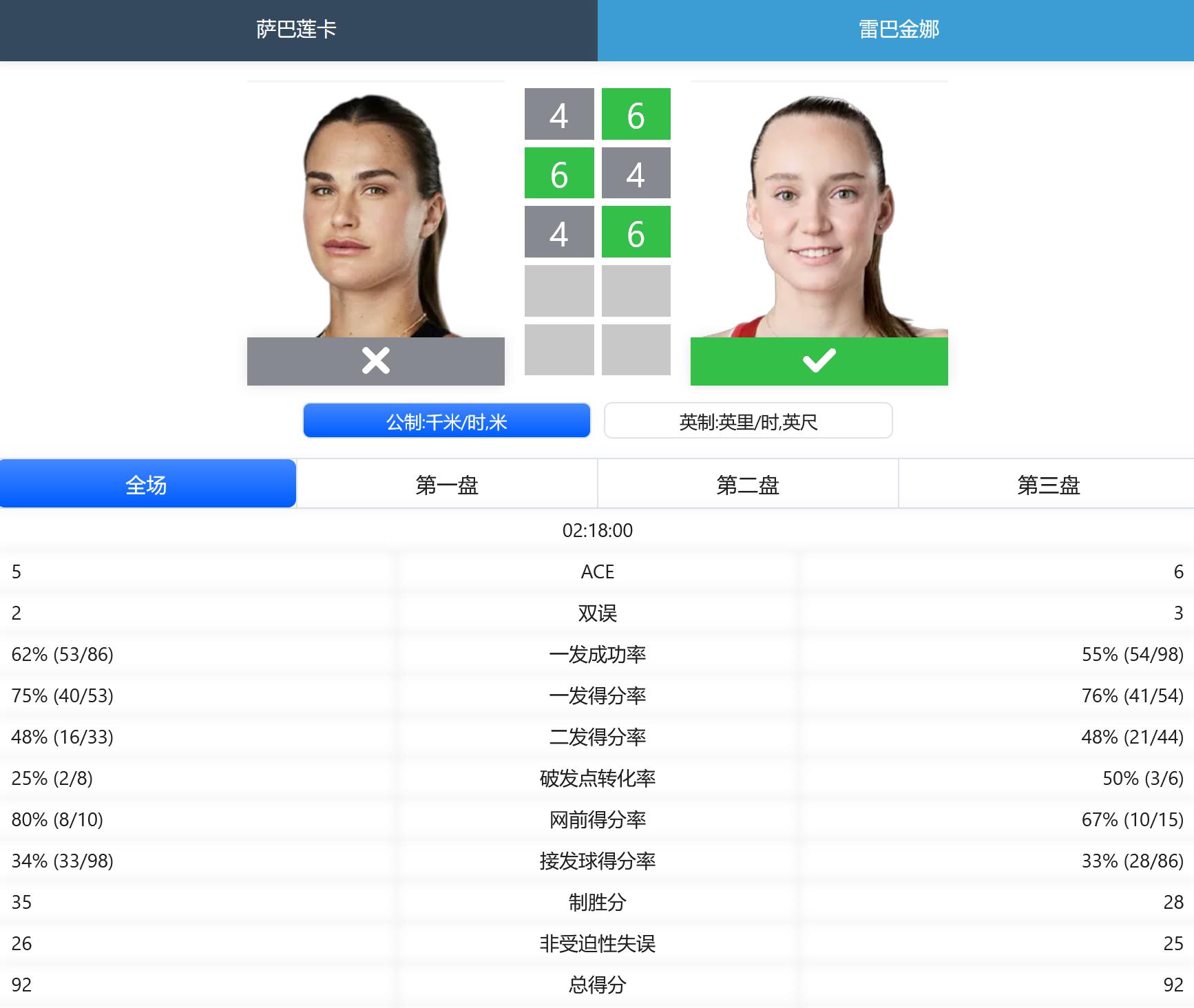 纵观全场数据,萨巴伦卡在制胜分方面是领先莱巴金娜的,非受迫性失误也仅多出1个。但是在破发点转化率上,仅有对方的一半,说明萨巴伦卡本场比赛就是输在了关键分上。