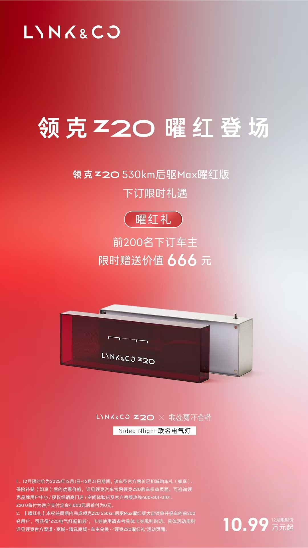 12 月期间,领克 Z20 推出多重限时购车权益,限时起售价 10.99 万元,为消费者降低购车门槛。具体福利包括 3000 元购车礼、3000 元保险补贴、至高 5500 元焕新礼、至高 10000 元限时选装基金等,金融方面可选择 2 年 8 万 0 息或 5 年 0 首付方案。针对 530km 后驱 Max 曜红版,前 200 名完成大定锁单并提车的用户,可获限时赠送的价值 666 元“领克 LYNK&CO Z20x 非必要不合作 Nidea・Nlight 联名电气灯”。此外,线下参与试驾并完成评价的用户,可领取试驾礼品。