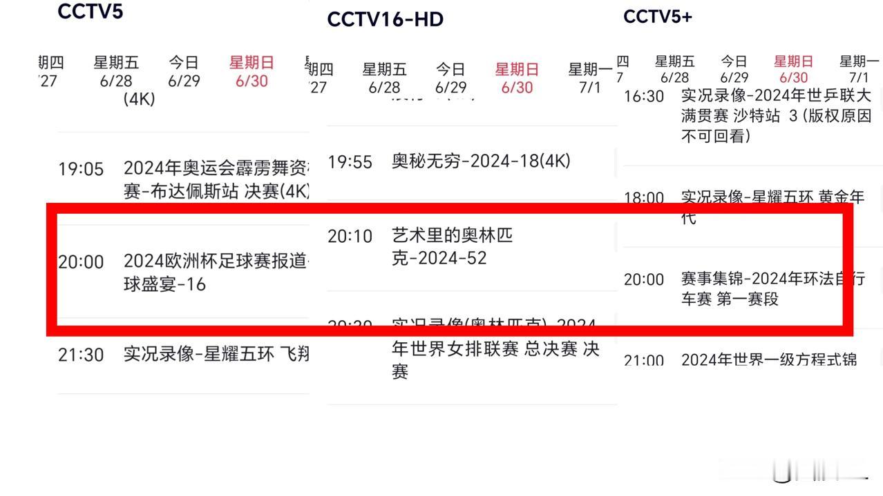 没想到!6月30日20:00,山东泰山客场对阵北京国安,作为每个赛季的重头戏,央视竟然选择不直播。 同一时间段,央5播“欧洲杯足球报道—足球盛宴”;央5+播“艺术里的奥林匹克”;央16播“环法自行车赛”。 京鲁大战的热度比不过足球盛宴欧洲杯,难道连一场自行车赛也比不了吗?