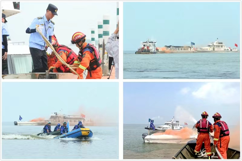 接到事故报告后,演练指挥部立即启动应急救援程序,随着总指挥一声令下,交通管制组、搜寻救援组、消防灭火组、无人机组、医疗保障组迅速出动,无人机第一时间升空开展搜救侦查,救援船艇随后以“一字开进、交叉列阵、多纵并行”的队形迅速赶往“事故”现场,在多部门协同配合下,20分钟内所有被困游客成功脱险。