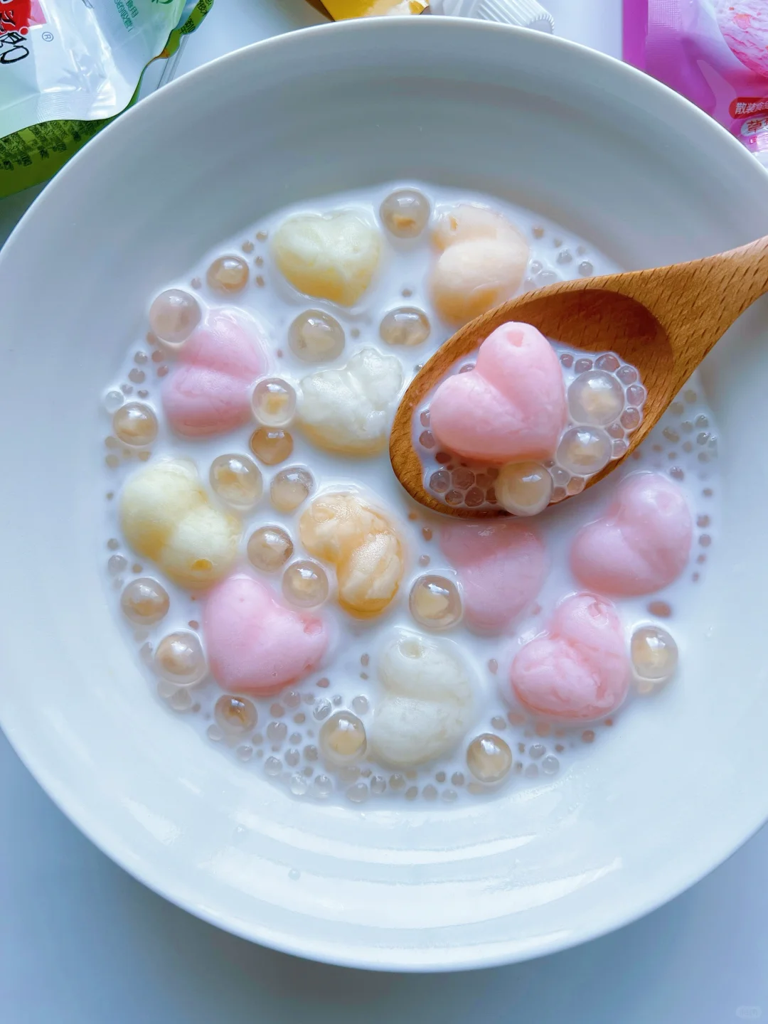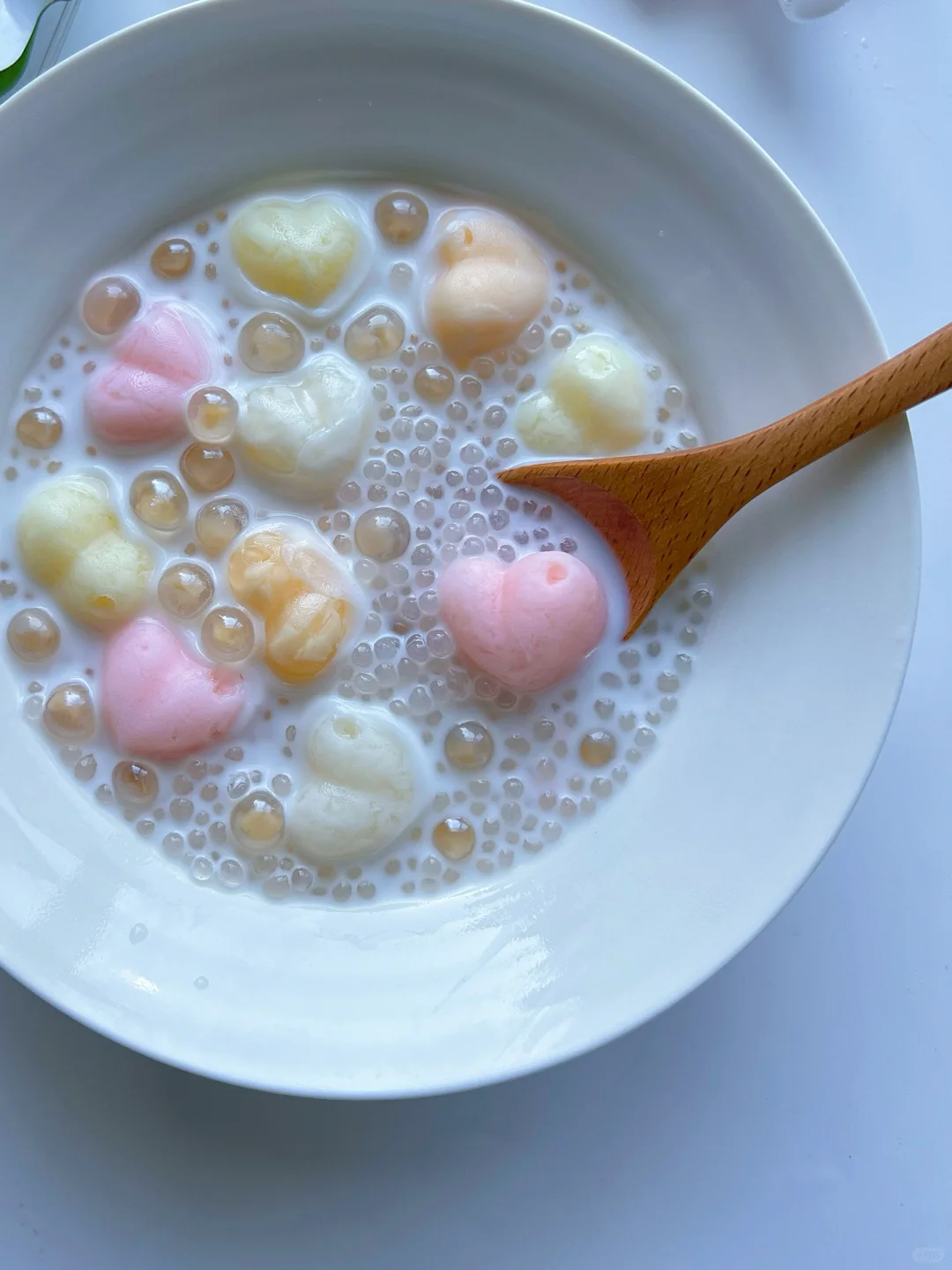 3️⃣组装:碗里倒入西米,再放入冻好的冰淇淋布丁,加入少许马蹄爆爆珠和椰汁即可