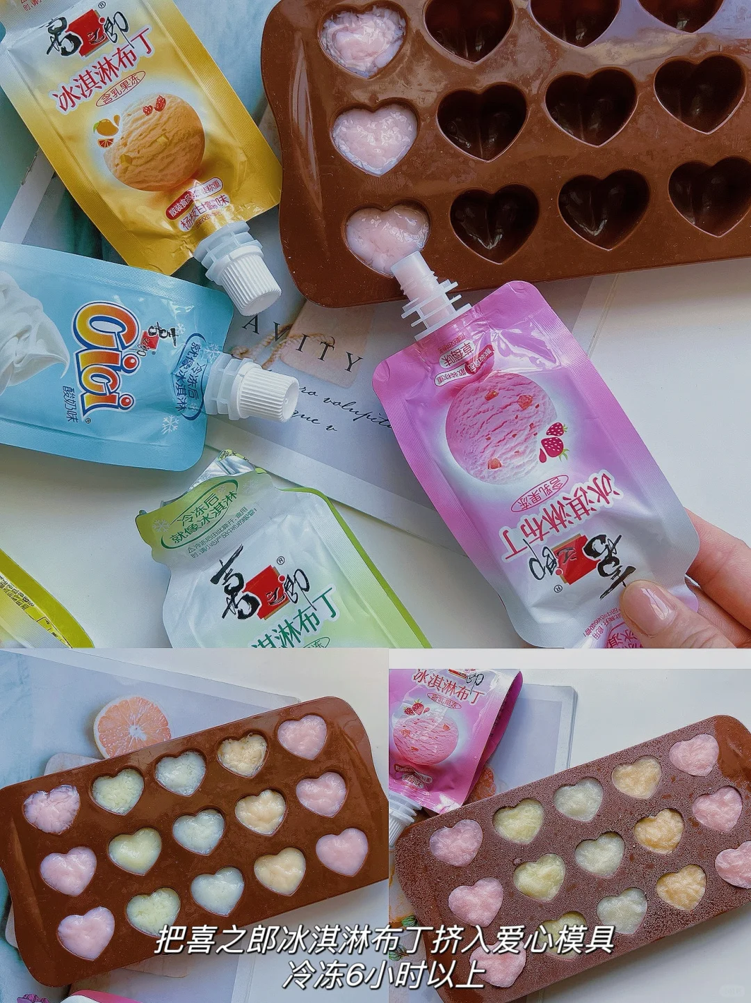 1️⃣把喜之郎冰淇淋布丁倒入爱心模具,冷冻6小时以上